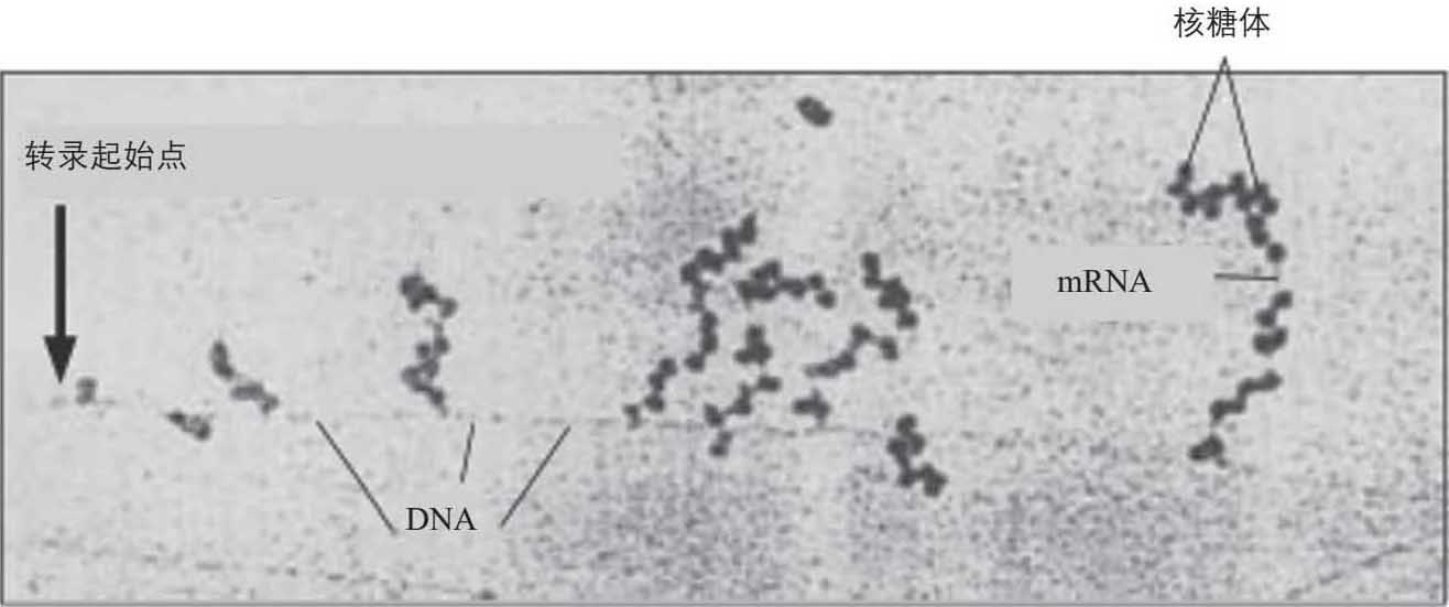 图3-3 大肠杆菌中的转录和翻译。在这幅电镜照片中,mRNA刚开始合成,核糖体就结合在mRNA分子上,开始蛋白质的合成(翻译),而不等待mRNA的生产完成。同一条mRNA分子上可以结合多个核糖体,同时进行蛋白质的合成