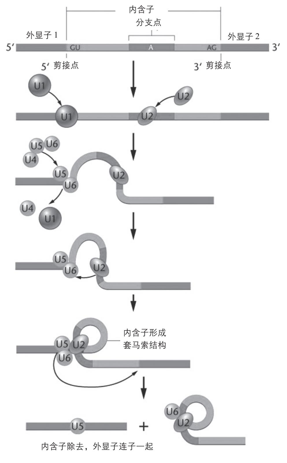 真核生物为了适应这种情况,发展出了细胞核把DNA和核糖体分开,同时发展出了更有效的方式来剪除mRNA中的内含子序列,这就是剪接体(spliceosome)。剪接体是由5个细胞核内的小分子RNA(snRNA,包括U1、U2、U4、U5、U6)和蛋白质组成的巨型复合物。5个snRNA分别识别内含子的各个部位,例如U1会先辨识内含子的5′端剪接点( 内含子5′端与外显子结合的地方),而U2 识别3′端剪接点(内含子3′ 端与另一个外显子结合的地方)上游的“分支点”。这个步骤将mRNA上要被剪切除去的内含子定位。然后,由U4-U5-U6组成的三聚体加入,使得分支位点上的腺苷酸被连到内含子的5′端上,使它脱离外显子,同时内含子的RNA链形成一个“套马索”那样的环状结构。脱离了内含子的5′外显子再与3′的外显子结合,内含子就被剪切掉了(图3-5)。