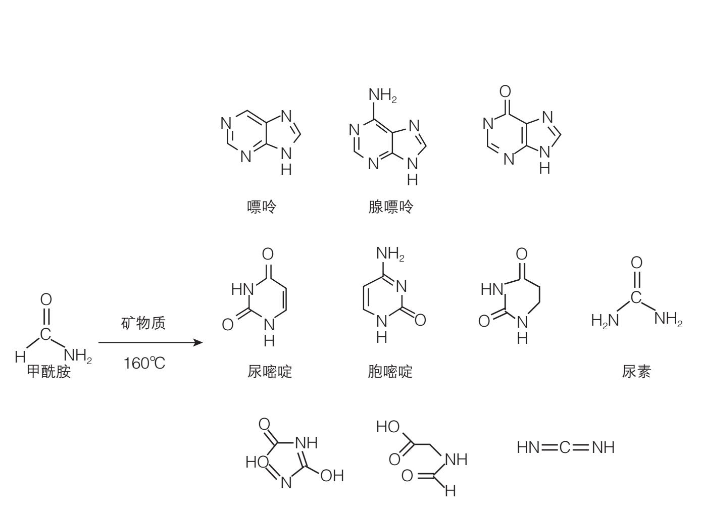 图1-5 宇宙中大量存在的甲酰胺在矿物质存在时受热,就可以形成多种有机物,包括组成核酸的嘌呤和嘧啶