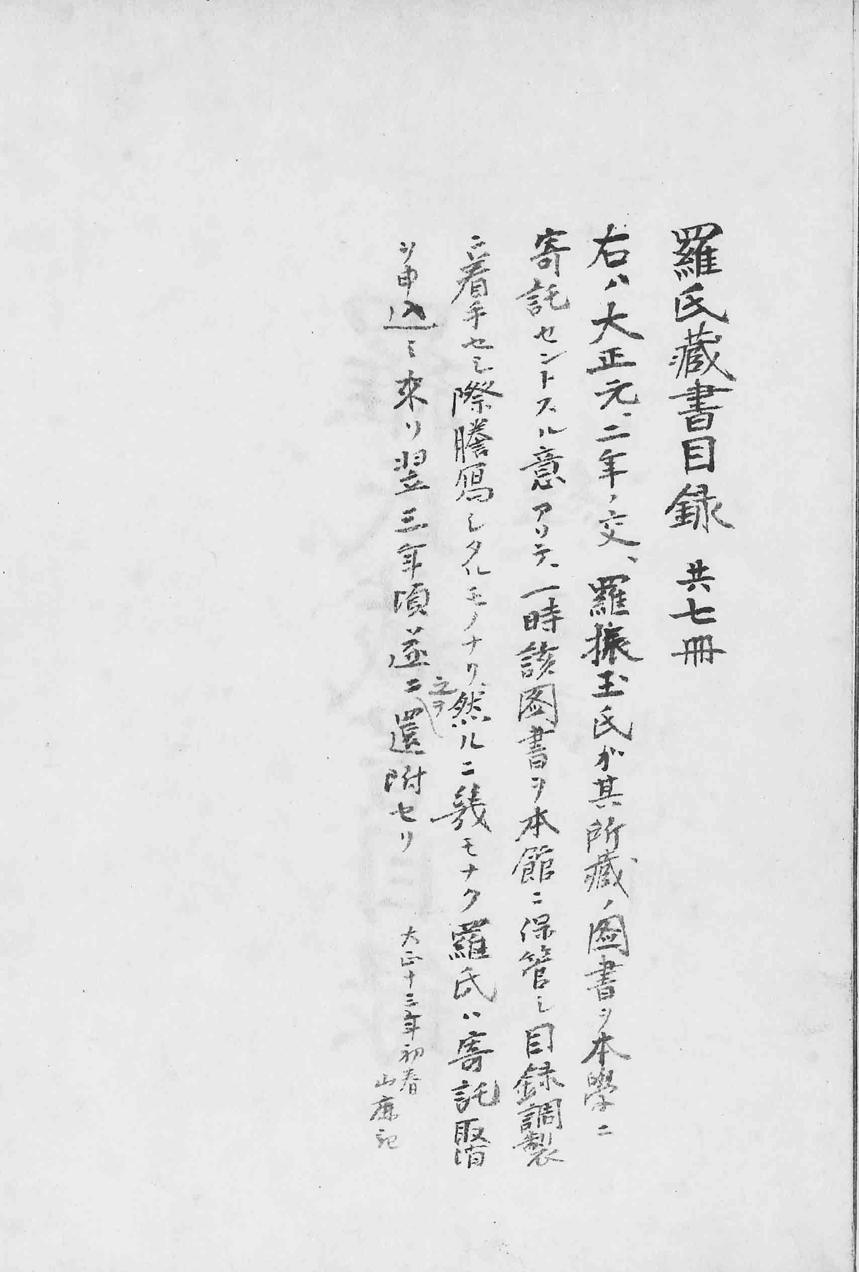 羅振玉、王國維在日本京都整理之藏書目録,羅繼祖云原稿已失,而據京都大學道坂昭廣考察,現存大連圖書館的《大雲精舍藏書目録》(發現之後命名,僅存普通本目録)即是羅氏藏書目録原稿,或在藏書運抵日本前已經編就。今存京都大學附屬圖書館的《羅氏藏書目録》是以大連圖書館藏稿爲基礎謄寫補正而成,遼寧省圖書館藏《羅氏藏書目録》則是稻葉岩吉又據京都大學本鈔寫。詳見書後附録道坂昭廣《關於京都大學附屬圖書館藏〈羅氏藏書目録〉》一文。根據道坂昭廣的梳理,京都大學附屬圖書館藏《羅氏藏書目録》是羅振玉大雲書庫藏書最爲全面完善的記録,故此北京大學國際漢學家研修基地「東亞漢籍研究工作坊」商請道坂昭廣教授居間聯絡,取得京都大學附屬圖書館影印出版授權,並撰文揭示其文獻價值。我們對道坂昭廣教授的大力協助表示由衷敬意,並對承擔編輯出版責任的北京大學出版社馬辛民主任、王琳編輯表示感謝。