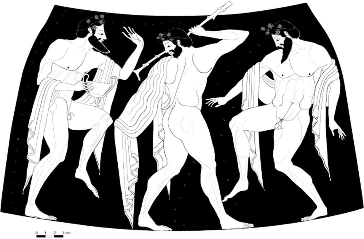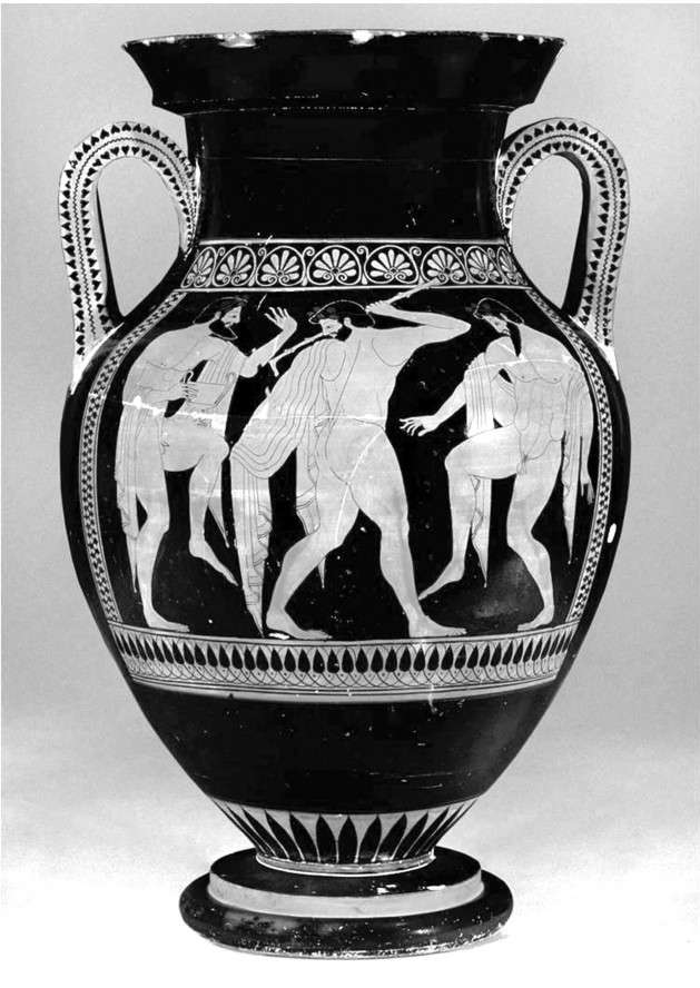 图1-8 欧西米德斯《饮酒狂欢者》(约前510—前500),双耳陶瓶,高61厘米,慕尼黑国立古物和雕塑收藏馆