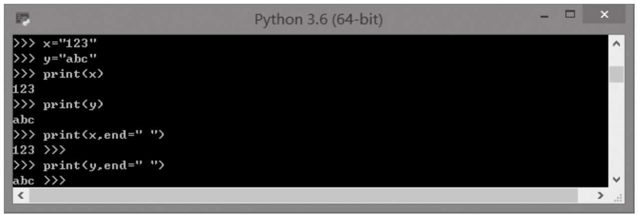 3.1节的第一个Python程序是输出一句字符串,使用了print语句,print默认输出是换行的,如果要实现不换行,需要在变量末尾加上end=""。来看下面的例子:
