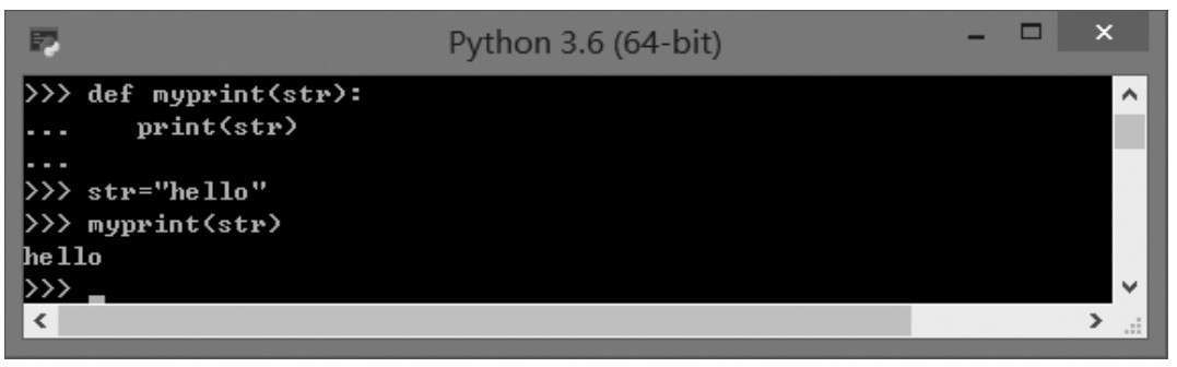 上面的函数代码体中只有一条语句,函数名称为“myprint”,输入参数命名为“str”,用于接收外部传来的内容,函数体中使用打印函数来打印外部传送来的字符。