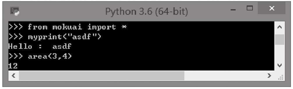上面这个模块中定义了两个函数,其中myprint函数用于实现输出一个字符串,area函数用于计算长方形的面积。
