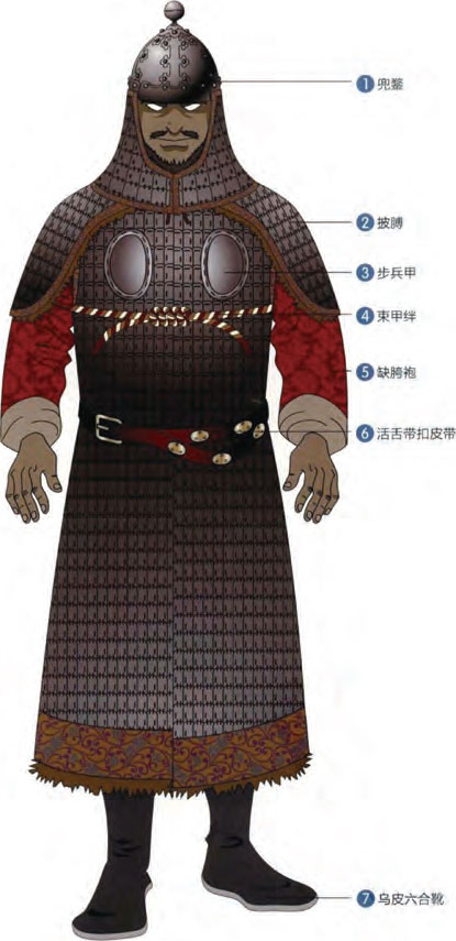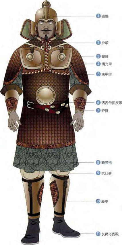 根据《唐六典·卷十六》记载,“甲之制十有三,一曰明光甲、二曰光要甲、三曰细鳞甲、四曰文山甲、五曰乌鎚甲、六曰白布甲、七曰皂绢甲、八曰布背甲、九曰步兵甲、十曰皮甲、十有一曰木甲、十有二曰锁子甲、十有三曰马甲。今明光、光要、细鳞、山文、乌鎚、锁子皆铁甲也”。虽然我们还无法完全准确复原这么多种铠甲的式样,但我们至少可以发现,在13种盔甲中,有6种完全是铁甲,而如“步兵甲”及“马甲”中有一部分也应为铁甲,可见铁甲的比例较大。