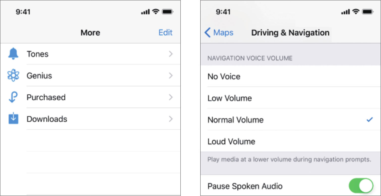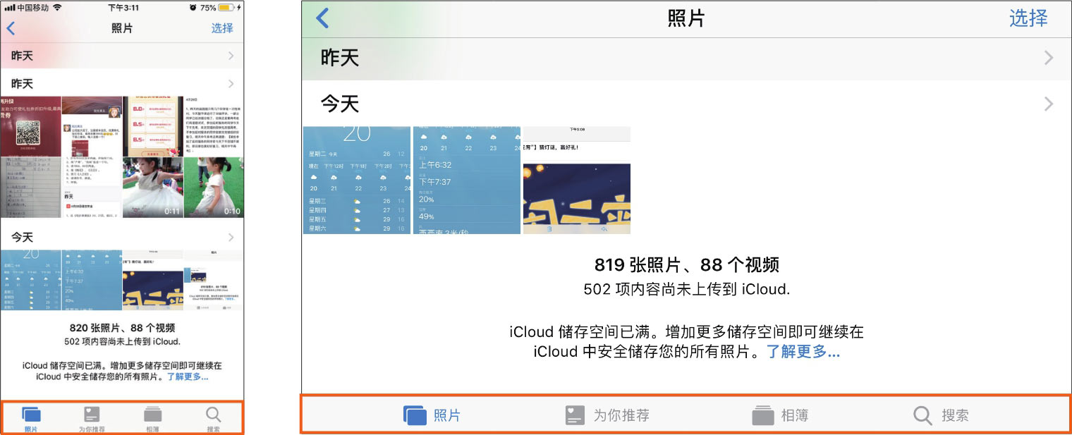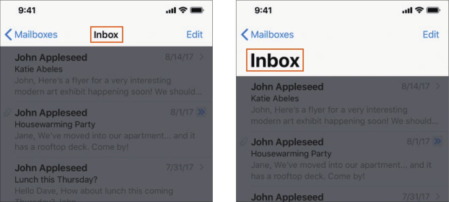 导航栏出现在页面的顶端,其上方是状态栏。使用导航栏可以在各个页面层级中穿行。当打开一个新页面后,导航栏左侧一般会有指向上一个页面的返回按钮,按钮标题一般为上一个页面的标题。大多数情况下,导航栏中的标题可以帮助用户理解当前视图的用途。导航栏中的标题文字有标准标题(见下左图)和大标题(见下右图)两种样式。在某些App中,使用大标题样式对文字进行增大、加粗,能够帮助用户在浏览和搜索时定位。