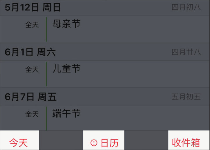 在设计工具栏中的按钮时,需要考虑是用图标还是用文字来表现。工具栏中的按钮数量超过3个时,适合使用图标按钮,而按钮数量小于或等于3个时,使用文字按钮表意会更清晰。如下图所示的日历App的工具栏就使用了文字按钮,通过在按钮之间设置合适的留白,增强了各按钮的辨识度。