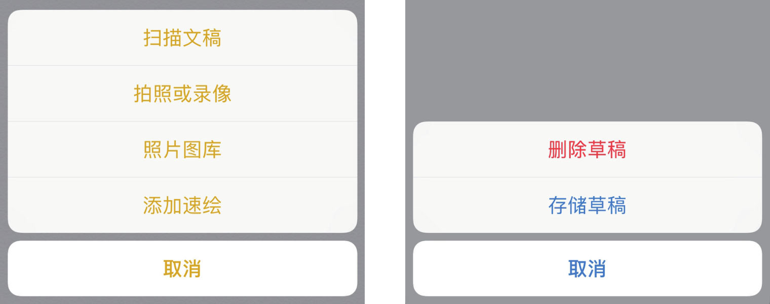 操作列表用于展示与用户触发的操作直接相关的一系列选项。操作列表通常会提供完成一项任务的不同方法,如下左图所示,这些操作不会永久出现在屏幕上,不占用屏幕空间。除此之外,在完成一项可能有风险的操作前,也可以利用操作列表获得用户的确认,如下右图所示。