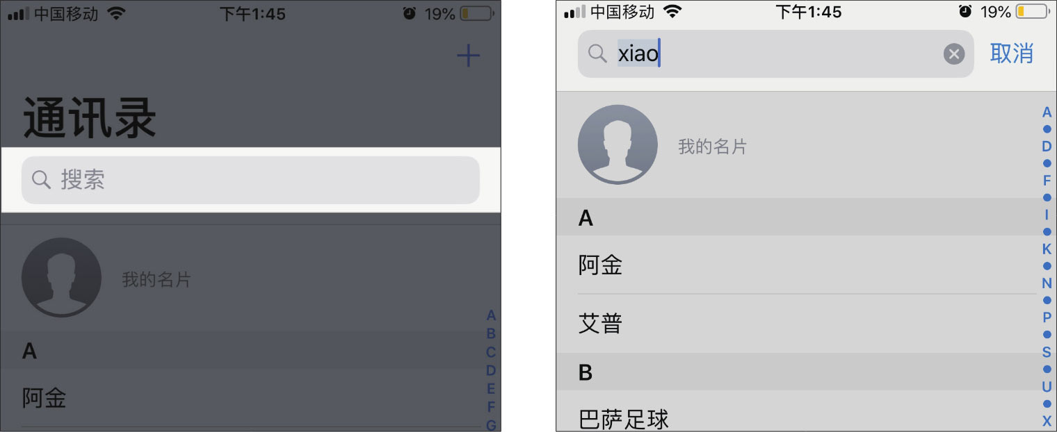 在搜索栏中输入文字可以搜索相关的内容。搜索栏可单独展现,也可在导航栏或内容视图中展现。在导航栏中展现时,搜索栏可以固定在导航栏上,以便随时使用,如下左图所示。大部分搜索栏都包含一个用于清空输入框内容的清空按钮和一个用于立即结束搜索状态的取消按钮。在搜索栏中输入文字后,就会显示清空按钮和取消按钮,如下右图所示。