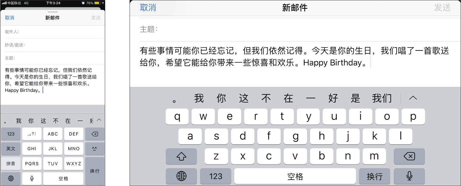 文本视图可以展示多行且有样式的文本内容。文本视图的高度可以为任意值,并且在内容超越视图的边界后可以进行滚动。默认情况下,文本视图中的文本是左对齐的,并使用系统默认的黑色字体。如果在文本视图下编辑内容,在轻点该视图时会弹出虚拟键盘。iOS系统提供了多种类型的虚拟键盘,每种类型都为特定的输入场景而设计,为了提高输入效率,在当前文本视图中弹出的虚拟键盘应符合该文本视图中的内容。下左图所示为竖屏文本视图,因此弹出的是适合单手输入的九宫格键盘;下右图所示为横屏文本视图,因此弹出的是更好操作的全键盘。
