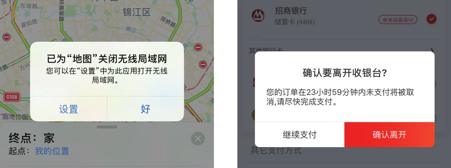 警告框用来传达与当前App或设备相关的重要信息,一般都需要反馈结果。警告框大多包含标题、可选信息和一到两个按钮等。在一个App中,应当严格限制警告框的个数,并且保证每一个警告框都能提供重要的信息,告知用户当前所处的情景,以及他们可以做什么等,如下图所示。