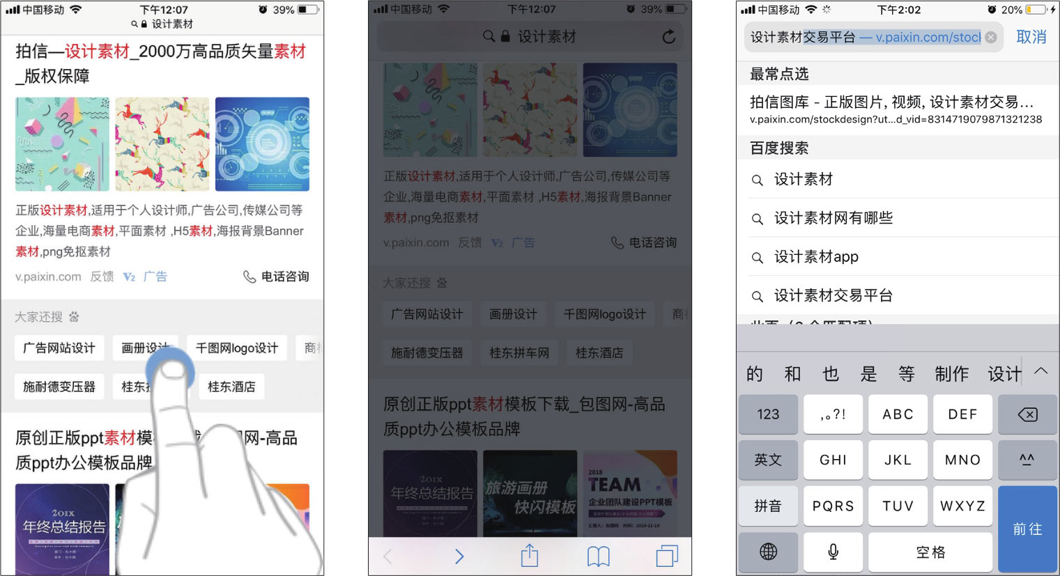 工具栏与标签栏一样,也出现在页面的底部,包含执行与当前视图或视图内容相关操作的按钮。当用户不需要它时,可以自动隐藏起来。例如,iOS系统内置的Safari浏览器,当用户向下滚动浏览页面内容时,工具栏会被隐藏起来,以为用户提供更多浏览空间,如下左图所示;若要重新显示工具栏,则点击屏幕下方,如下中图所示;除此之外,当用户启用搜索,在虚拟键盘弹出的情况下,工具栏也会被收起,如下右图所示。