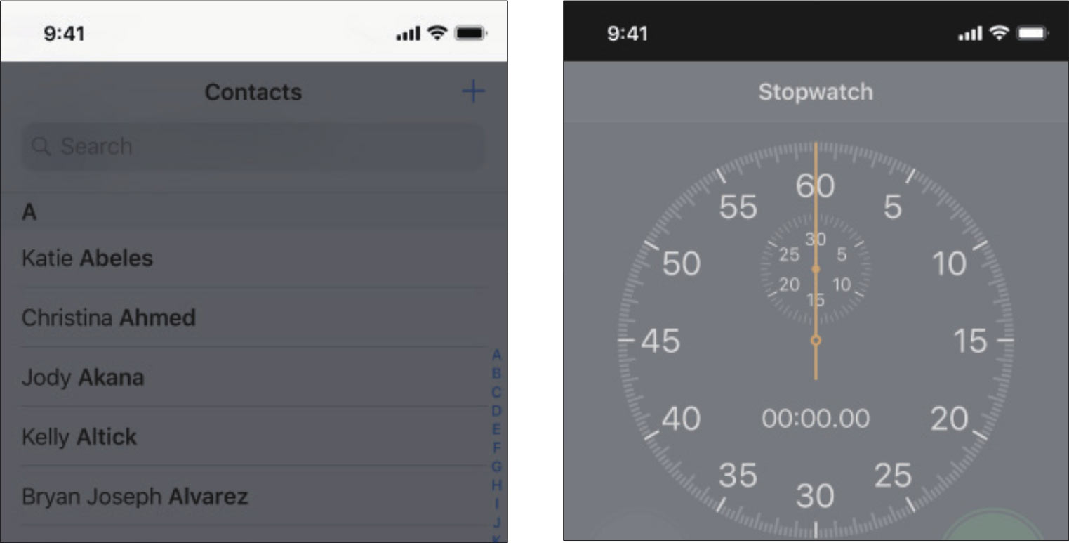 iOS系统定义了平铺型和分组型两种表格视图样式。在平铺型样式中,每行均可为有标签的列表项,右侧可选择添加一个垂直的索引,如下左图所示,并且可以在第一个列表项之上添加标题,在最后一个列表项之下添加脚注。在分组型样式中,行会以多个分组显示,每组均可以有标题和脚注,如下右图所示。分组型表格视图至少包含一组列表项,每组至少包含一项内容。分组型表格视图不能包含索引。