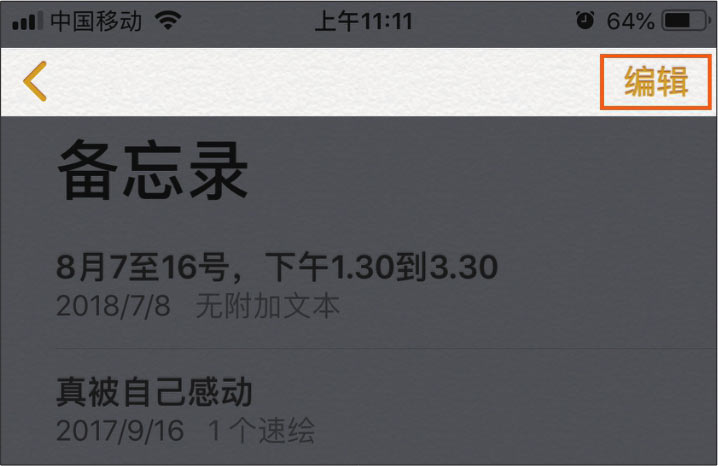 下图所示为iOS系统内置的备忘录App的UI,因为其内容已能清晰地表现当前所在的环境,所以就没有添加标题文字,另外,为了方便操作,在导航栏右侧设置了“编辑”按钮,用于编辑备忘录内容。