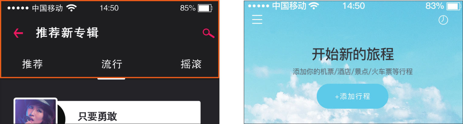 默认情况下,状态栏的背景是透明的。因此,为保持状态栏的可读性,在设计时不要在其后方放置看似可交互的内容。为避免状态栏中出现可交互的内容,通常会采用两种方法进行处理:方法一是使用导航栏,在使用导航栏后,将会自动应用导航栏的背景色作为状态栏的背景色,并能保证内容不会出现在状态栏后方,如下左图所示;方法二是在状态栏后方展示自定义的图片,如渐变色或纯色图片,如下右图所示。