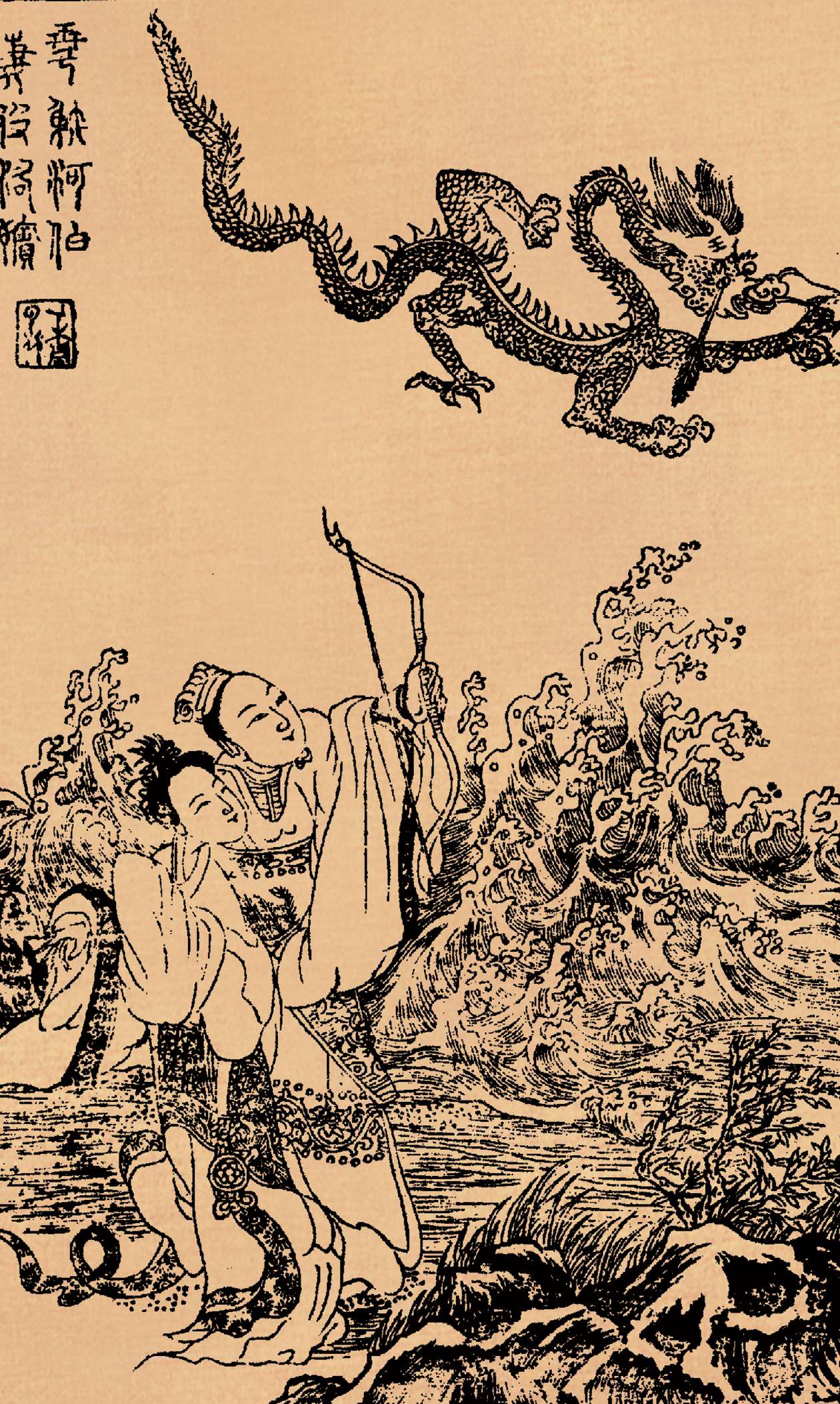 后羿一听是河伯,顿时怒冲心头,冷笑一声,说:“我就是大禹。”说着张弓搭箭,“嗖”的一箭,射中了河伯的左眼。
