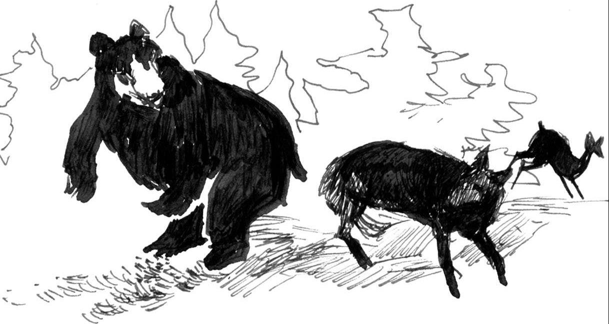 开头是又小又窄的兽蹄印,步子走得安安稳稳。森林通讯员对此不难解读:是一只鹿在缓步前行,似乎并没有感到某种威胁正在悄悄地逼近它。突然,这些蹄印的旁边,出现了许多大脚爪印,于是鹿的足迹也就变成奔跑跳跃式的了。