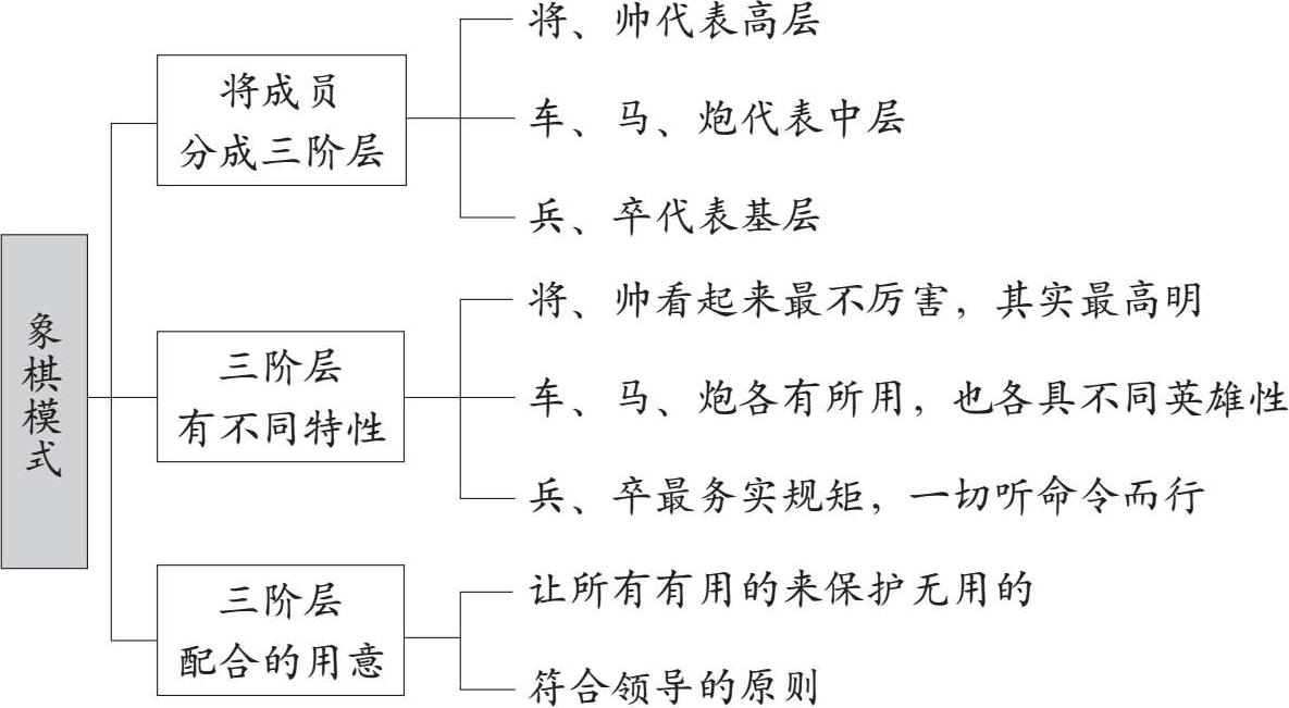 如果把一个组织大略分成三个阶层。象棋的将、帅,可以代表高层领导,车、马、炮为中层领导,而兵、卒则代表基层员工。三阶层各有不同特性,必须互相配合,才能各自发挥所长而产生总动员的效果(如图2-5)。