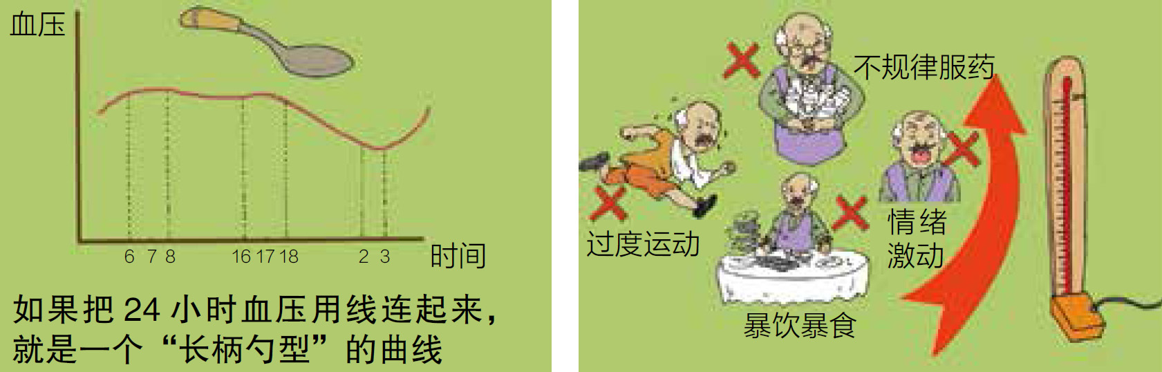 即便在一天内,血压也会波动,通常睡觉时血压下降,活动时血压上升。因此,健康人白天活动时血压高,夜间睡觉时血压低,并形成“两峰一谷”的规律,即在上午6:00~8:00血压升到第一高峰,下午16:00~18:00再次升到第二高峰,不过略比第一高峰低,此后血压趋于平稳,到凌晨2:00~3:00降至最低,如果把24小时血压用线连起来,就是一个“长柄勺型”的曲线。