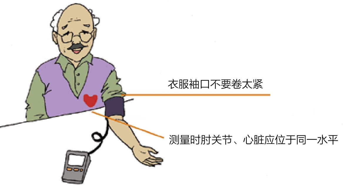 首次测量时,可以两侧都测,以血压高的一侧为准。偏瘫者测量健康的那条胳膊,测量时肘关节、心脏应位于同一水平。衣服袖口不要卷太紧,血压计袖带下缘应在肘弯上2~3厘米,松紧度以放入两个手指为准。