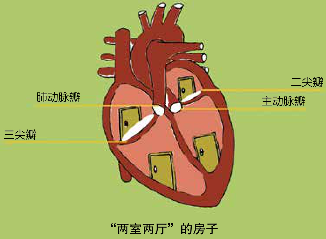 房室口处、心腔与大动脉相连处都有“阀门”,即心脏瓣膜。右心房和右心室间的“阀门”由三个半月形的心脏瓣膜组成,称为“三尖瓣”;左心房和左心室间有两个瓣膜,叫“二尖瓣”。心腔和动脉间的“阀门”有三个半月形瓣膜。右心室与肺动脉相连处是“肺动脉瓣”,左心室与主动脉相连处是“主动脉瓣”。