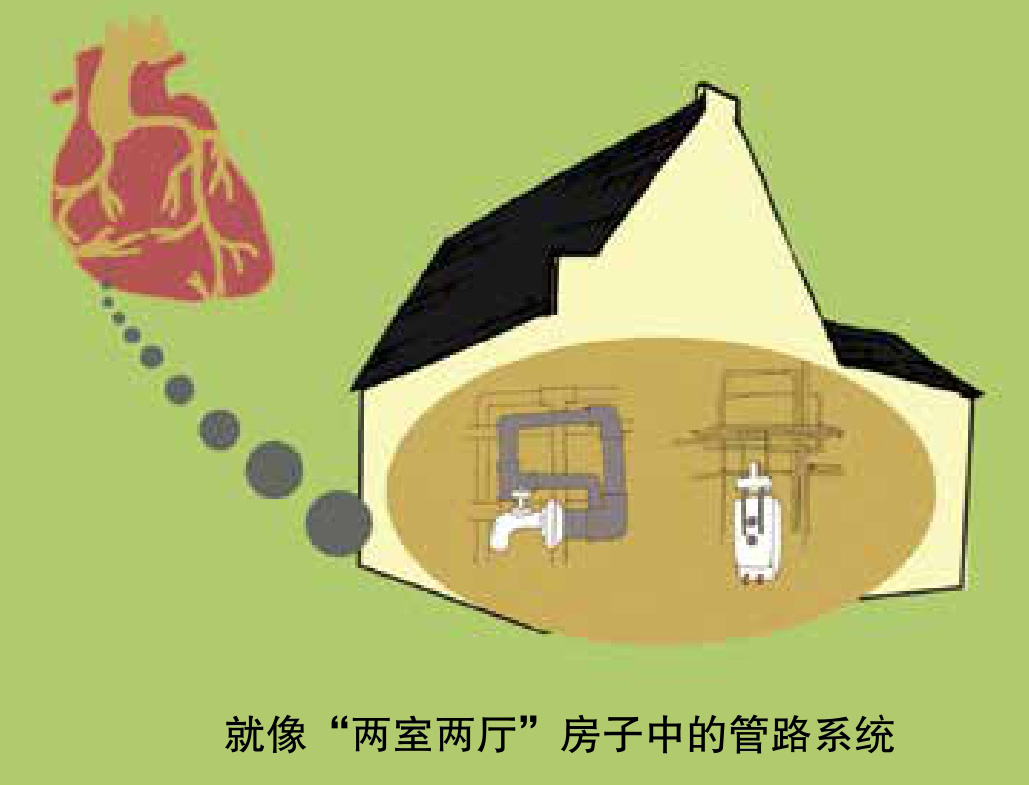 心脏本身也需要营养物质和氧气供应,以保持健康,向心脏提供血液的血管就叫“冠状动脉”,相当于“两室两厅”房子的管路系统。
