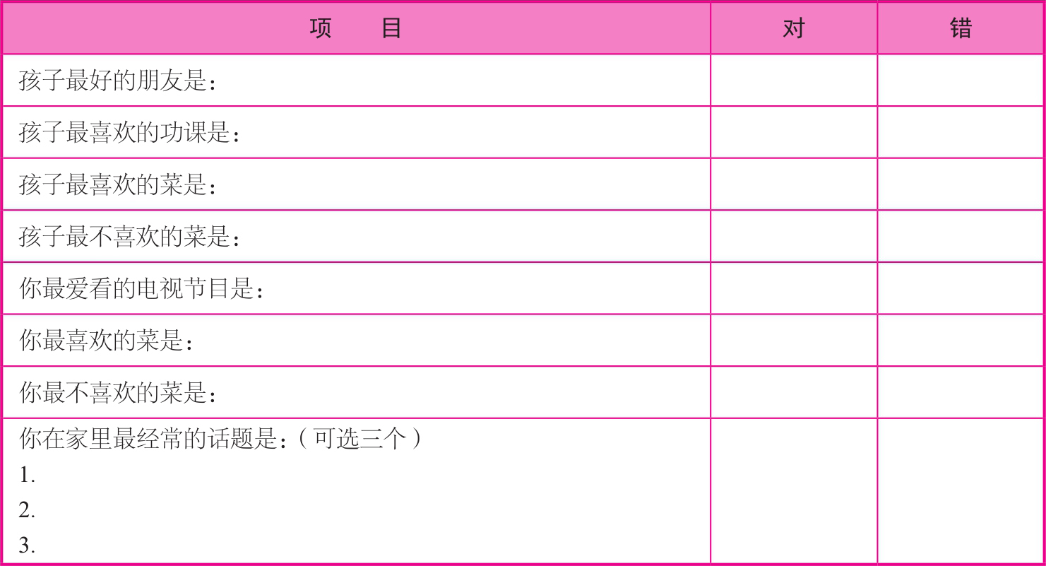 俗话说“知子莫若父,知女莫如母”,很多爸爸妈妈觉得自己对孩子了如指掌,其实在前面完成孩子档案的过程中,有些父母已经对自己的这个想法大打折扣了。请你根据平时了解的情况填写下表中的各项,填好后暂时放下,并让孩子填写表格“认识父母”,然后进行比对,看看你有几个答对了,几个答错了,就能大致知道你和孩子之间的了解有多少了。