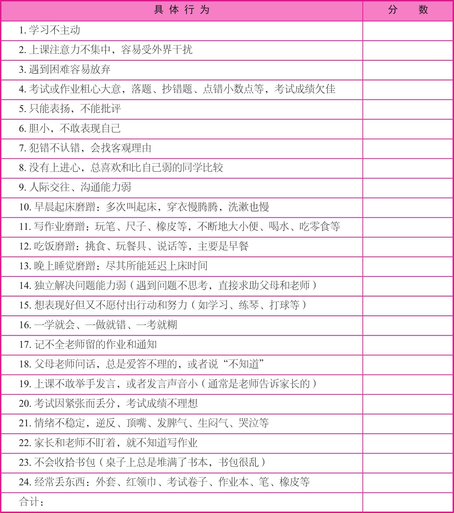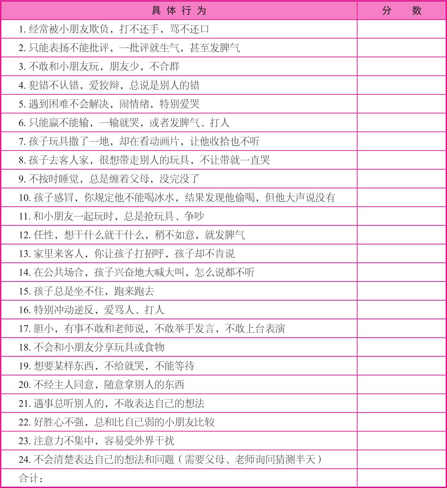 请你根据孩子的真实情况快速记分,做完24题后,累计总分。评分标准:如果以下行为经常出现记2分,偶尔出现记1分,没有出现过记0分。