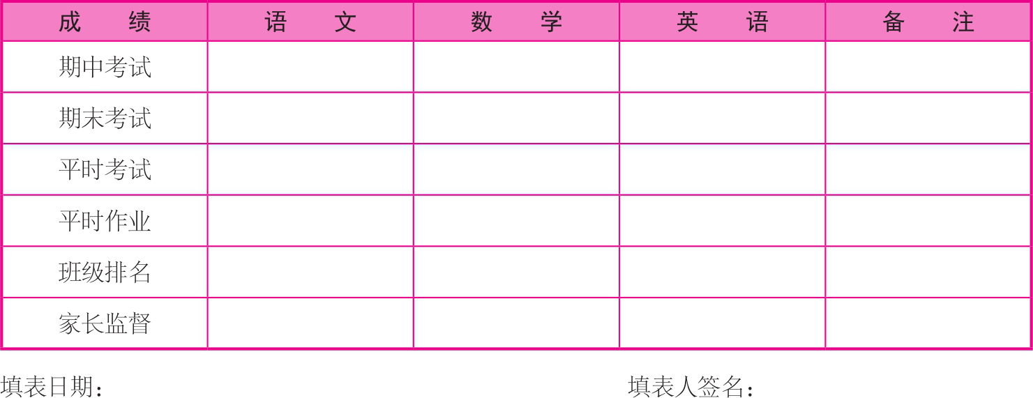 (4)班级排名:如果有排名可以记录下来;如果没有,请家长根据自己的判断来填写,目的是给自己提供参考,比如10名左右,20名左右,或者中等、中上、中下等。