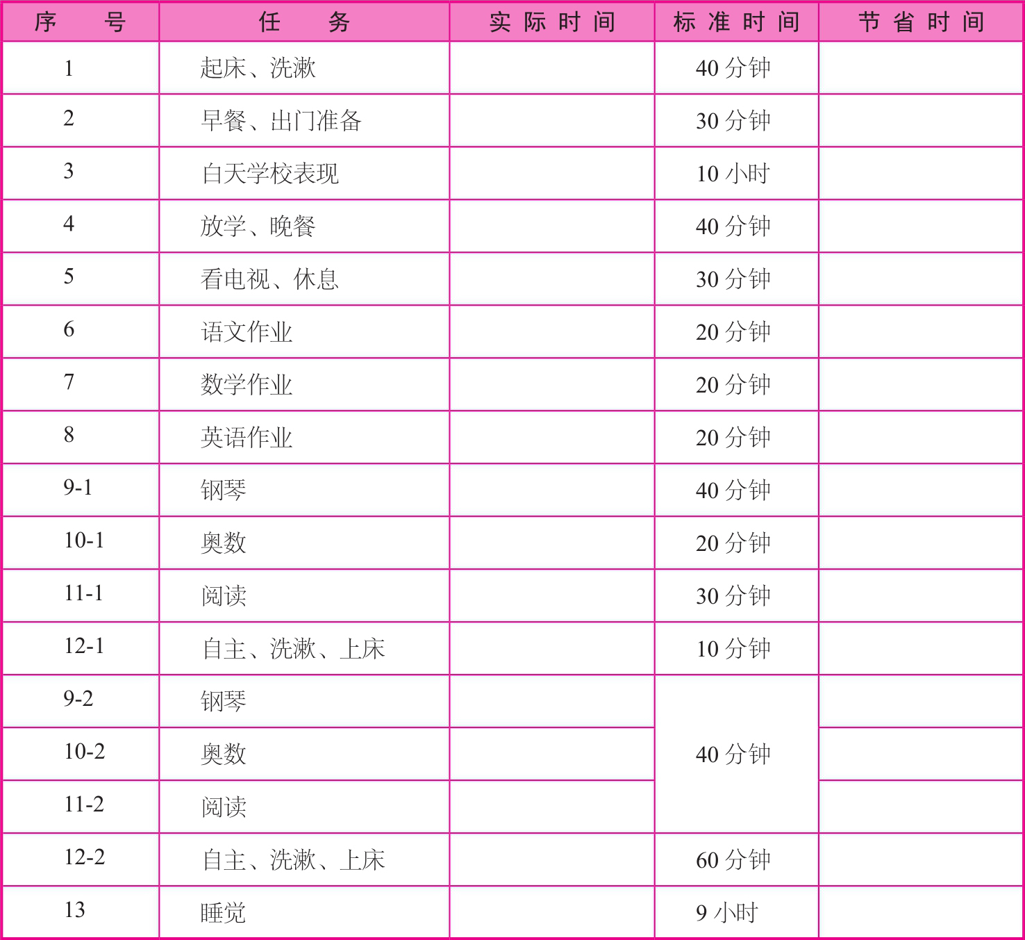 为了保证A类任务顺利完成(孩子自主时间),就要适当减少C类任务(钢琴、奥数、阅读),对比以上任务清单中两类第9~12号各项目的时间变化——用后一类(9-2~12-2)的任务取代前一类(9-1~12-1)的任务,即减少钢琴、奥数、阅读的时间,增加自主、洗漱、上床的时间。事先和孩子约定如果没有按时上床,第二天要先洗漱,后自主时间。