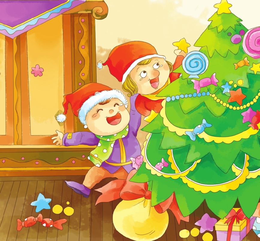 在那儿,房间吊灯的下面,竟长出了一颗大枞树。他可真大啊!四周还燃着篝火,堆放着那么多玩具。一群人围着大枞树跳啊,叫啊叫的。