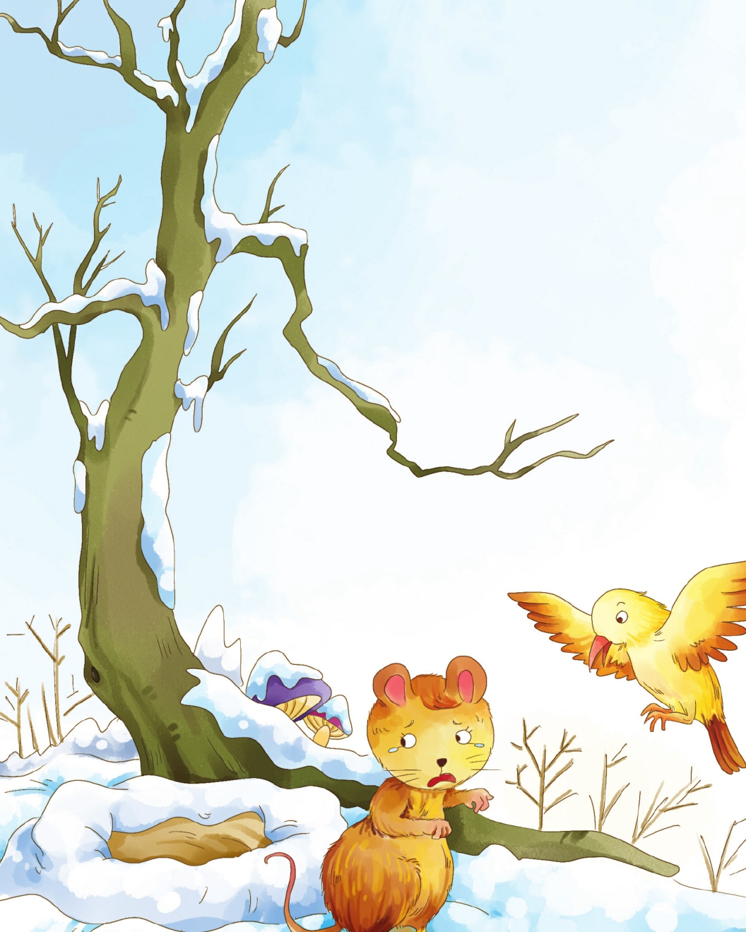 “哎呀,差点没吓死我!”林鼠气喘吁吁地说,“刚才我正在被雪堆覆盖的乱树枝里跑着,突然,一个不小心,掉到了一个好深的大坑里,那竟然是个狗熊的窝呀。母狗熊还躺在里面呢,身边还有两只刚出生的小熊,毛茸茸的。多亏他们睡得沉,没发现我。”