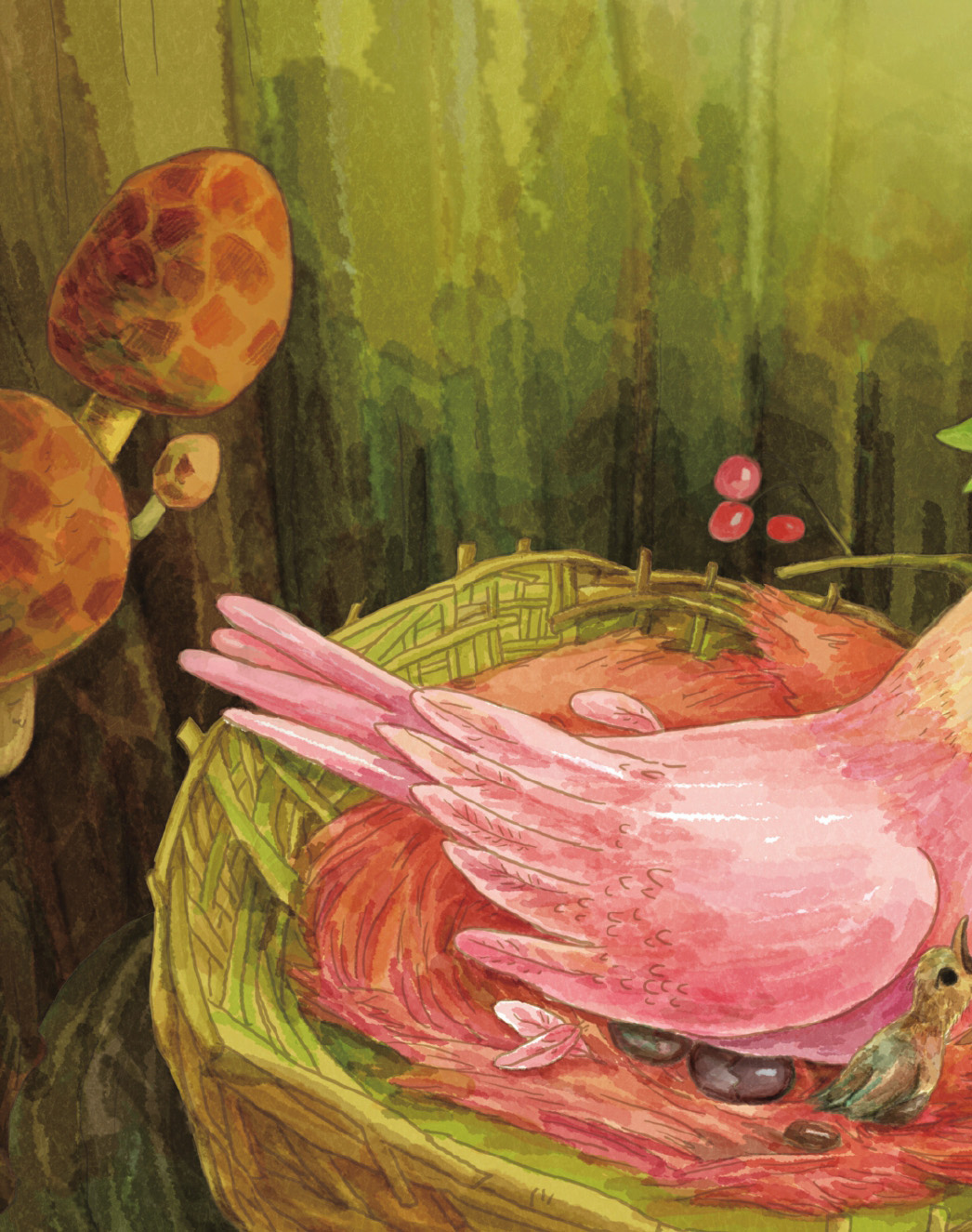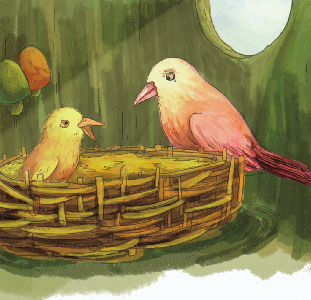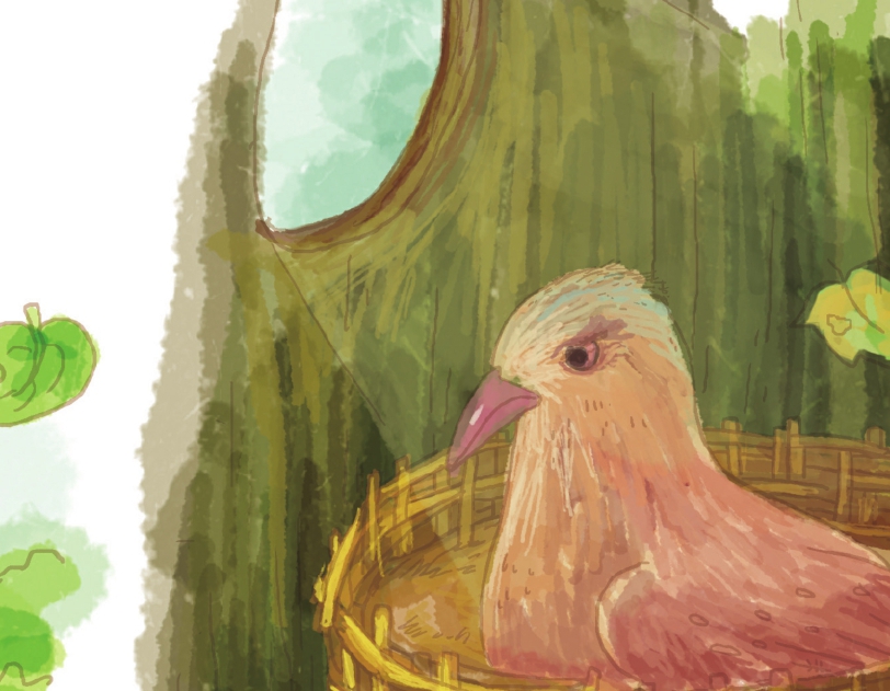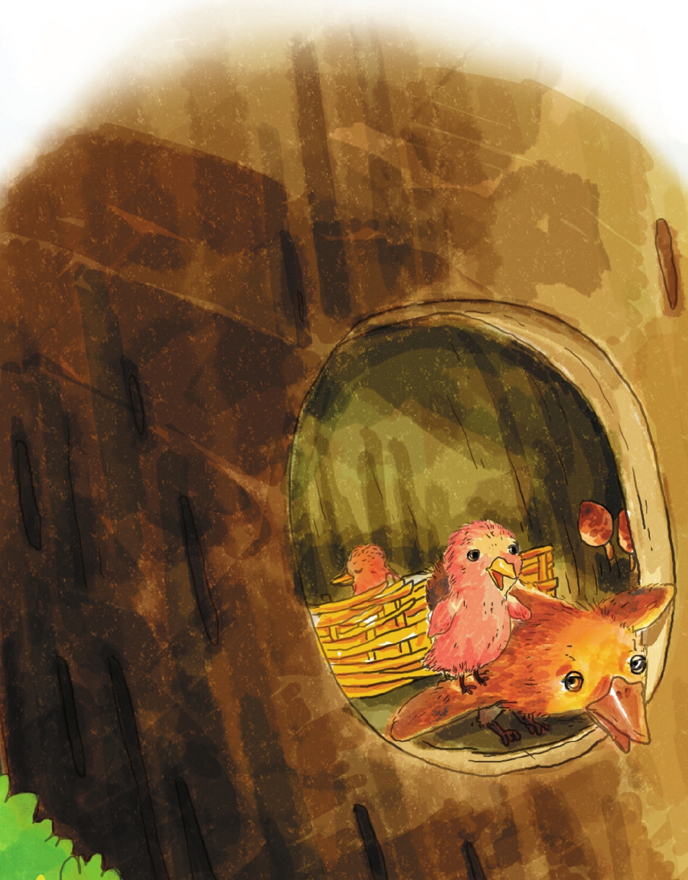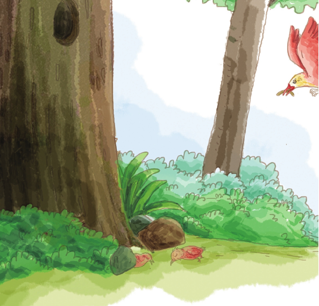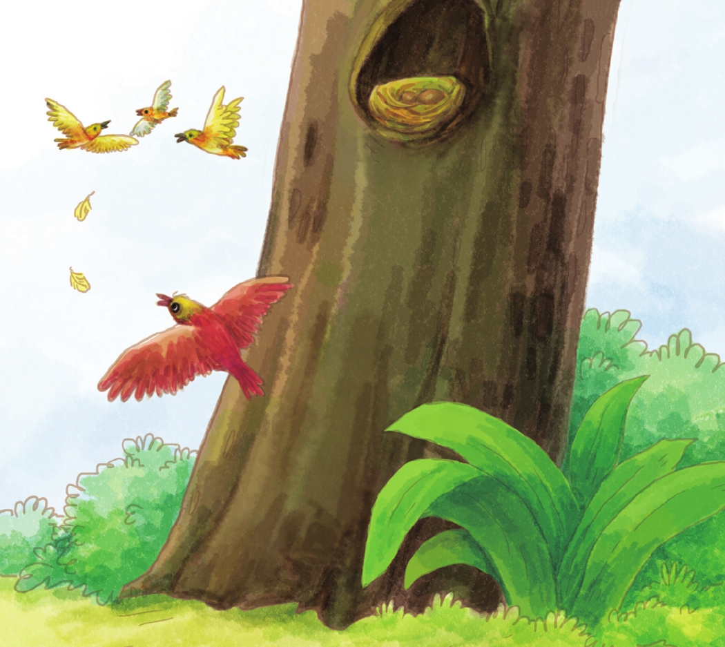 兔尾鸟夫妻俩只能沉默地摇摇头,无奈地往老橡树树洞的方向指了指,只听树洞里传来了小丑鸟饥饿的“吱吱”声,接着布谷鸟宽大的嘴巴从树洞里探了出来。