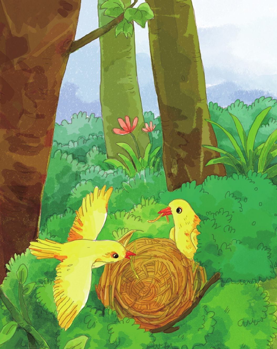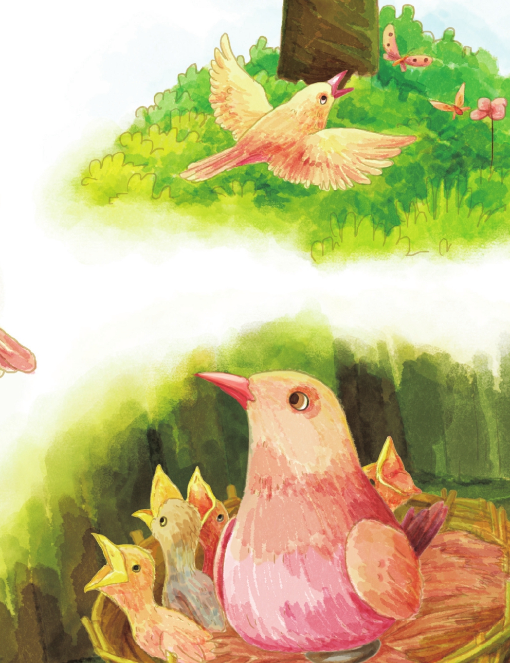 这时候,小鸟宝宝们马上就要出生啦,鸟爸爸和鸟妈妈们都非常期待和关心自己的小孩,所以它们急着要给宝宝们建造一个温暖的窝。