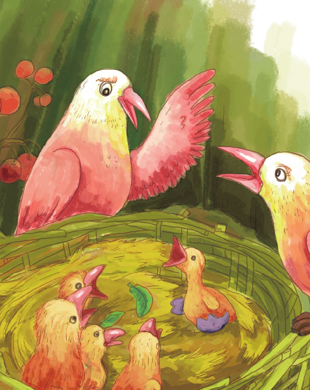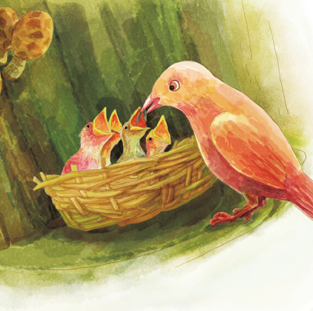 这样又过了几天,四个宝宝被父母亲喂得饱饱的,已经可以看出,它们长大了一点儿,光秃秃的小身子也长出了羽毛。这时,最后一个宝宝才从第五只蛋壳里钻了出来,它看起来有些不一样,胖胖的,小小的,丑丑的,笨笨的。