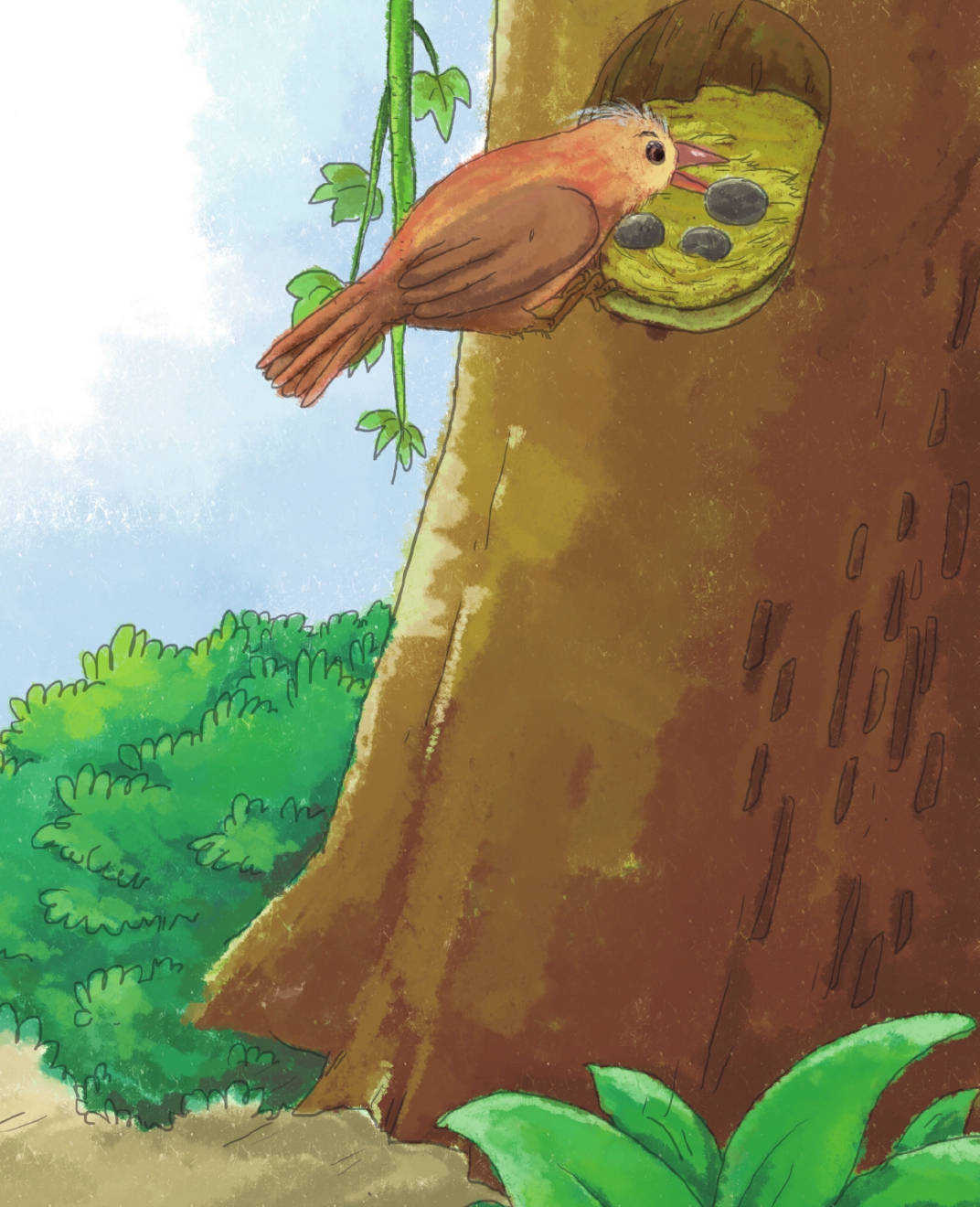 于是小女孩开始用木棍用力地敲打树干,树洞里的小布谷鸟听到了震耳欲聋的巨响,仿佛炸雷一样可怕,惊吓中它使尽全身的力气站了起来,用翅膀扶着墙,猛地冲向树洞口。