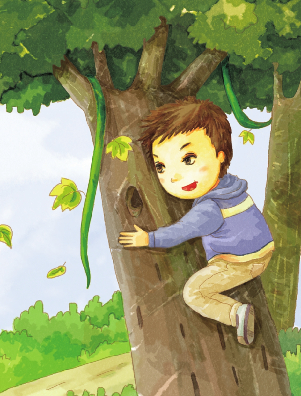 小男孩好奇地抬起头来,正巧看到了那个树洞,顽皮的他三步并作两步地爬上了树。
