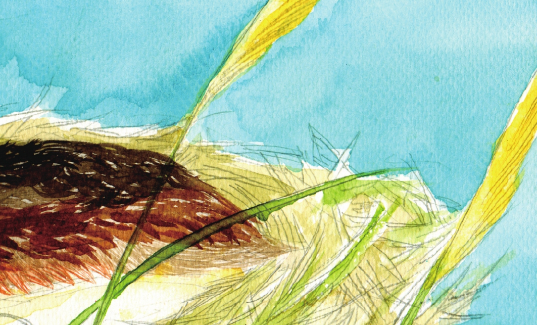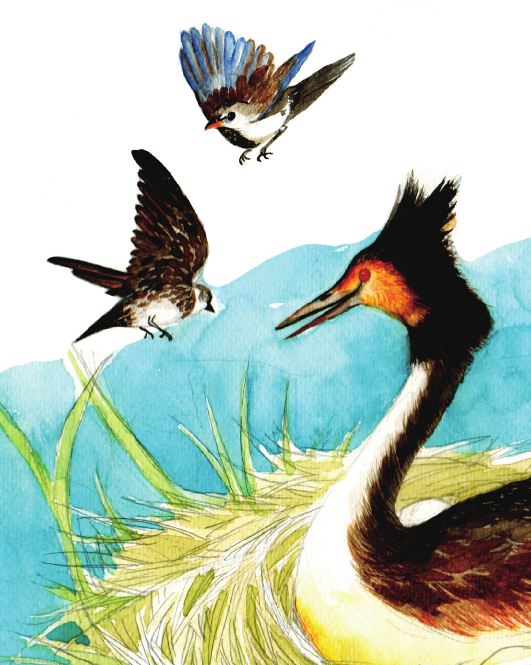小沙燕飞落到小岛上,刚落下,它惊奇地发现,原来小岛是漂浮在水面上的。那是一堆漂浮在湖面上的干芦苇。在干芦苇的中间有个坑,坑底铺的是柔软的沼泽草。草上还有几个凤头的蛋,上面盖着一层薄薄的细碎的干芦苇。