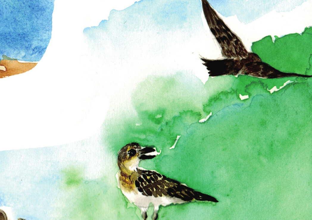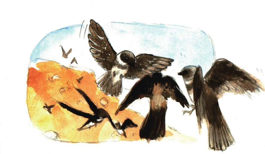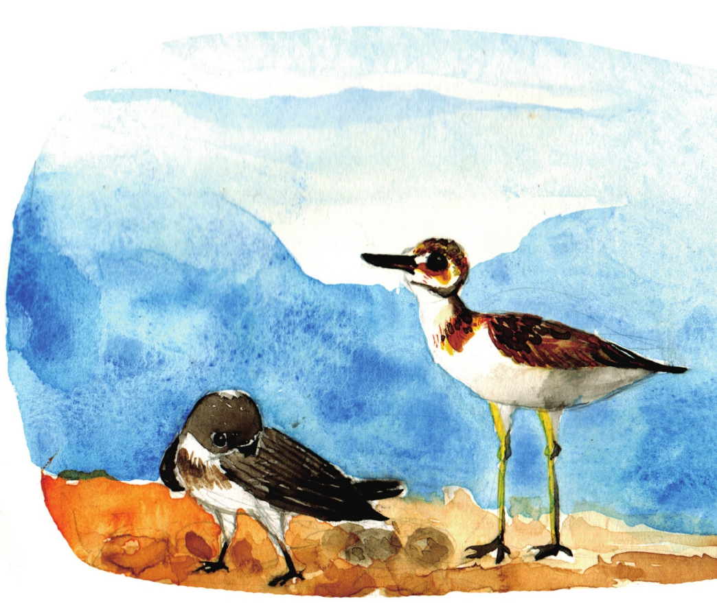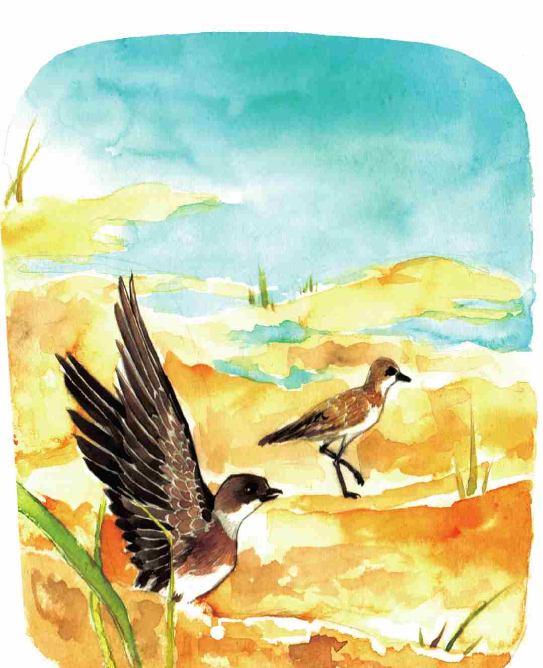 沙鸻跑了几步路,用嘴指指沙地,然后它一连鞠了好几个躬,身子在小细腿上颤颤颠颠的。它说:“喏,小沙燕,这就是我的家。请进吧!”