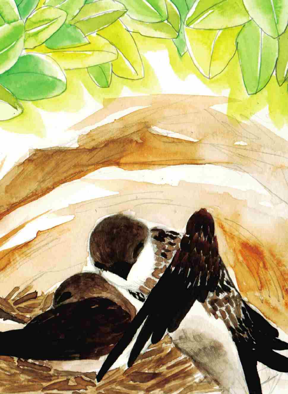 断壁上满是窟窿,那都是沙燕的家。小沙燕钻进了其中一个。进去之后,沿着又窄又长的过道跑了进去。