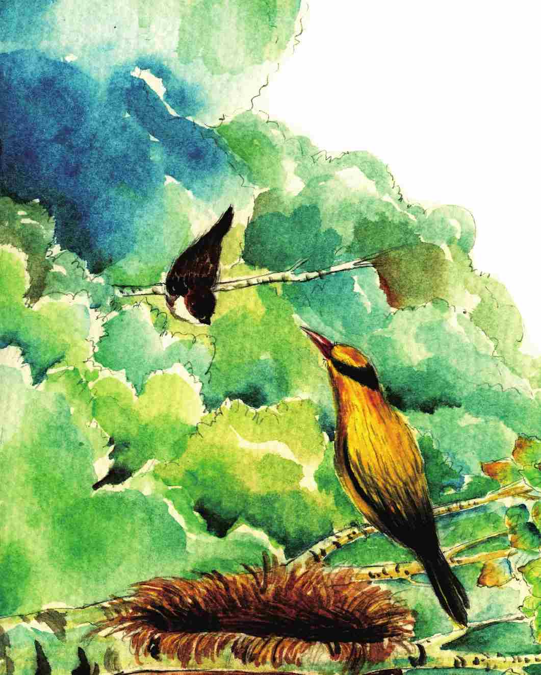 林鸽告诉小沙燕,黄鹂的家在丛林里那棵最美丽的白桦树上。