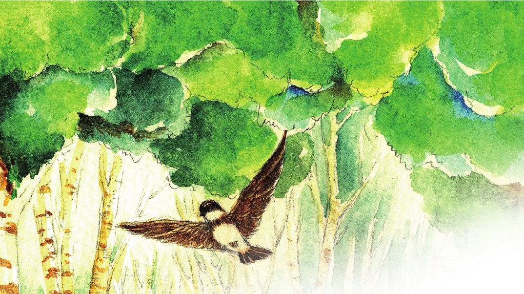 这下,小沙燕吓傻了,心脏剧烈地跳着。它赶紧向后一退,飞到森林上空,头也不回地逃走了。