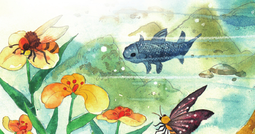 它继续上路,不久,就游到了森林。它在黄色的水草丛中发现了一块空地,一个理想的建造房屋的地点。