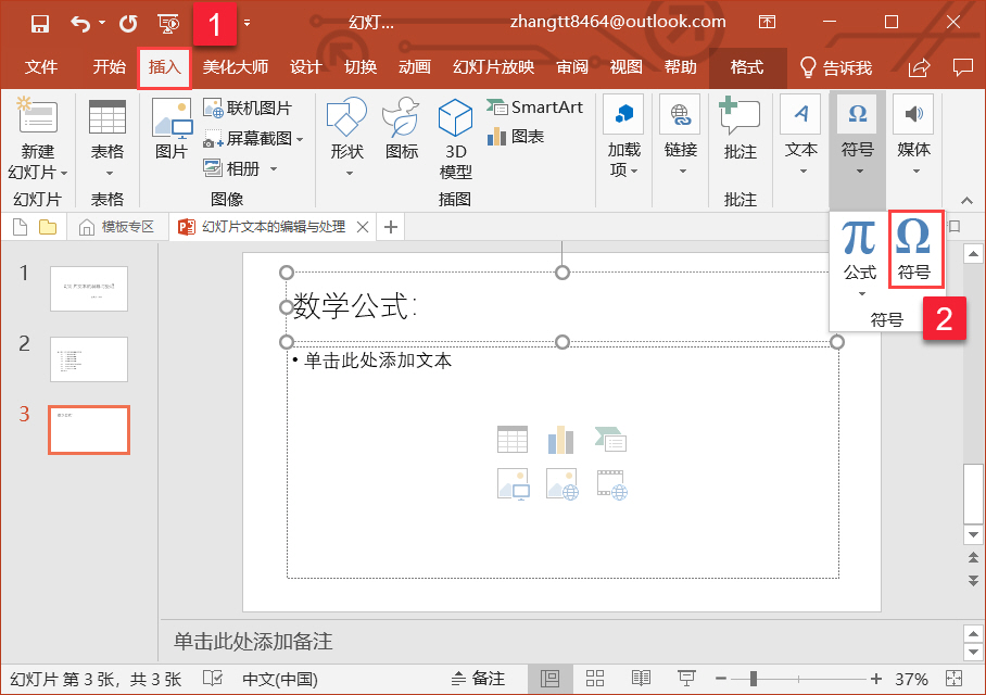 步骤1: 打开PowerPoint文件,选中第三张幻灯片,将光标定位到标题占位符中,切换至“插入”选项卡,单击“符号”组中的“符号”按钮,如图3-10所示。