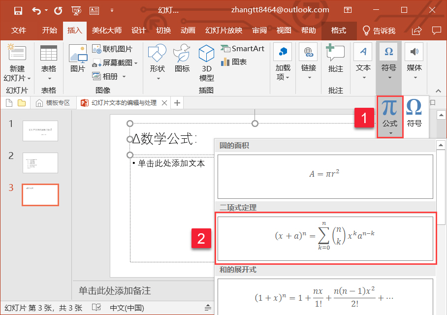 步骤4: 将光标定位在“:”后面,切换至“插入”选项卡,在“符号”组中单击“公式”下拉按钮,然后在展开的公式库中选择“二项式定理”样式,如图3-13所示。
