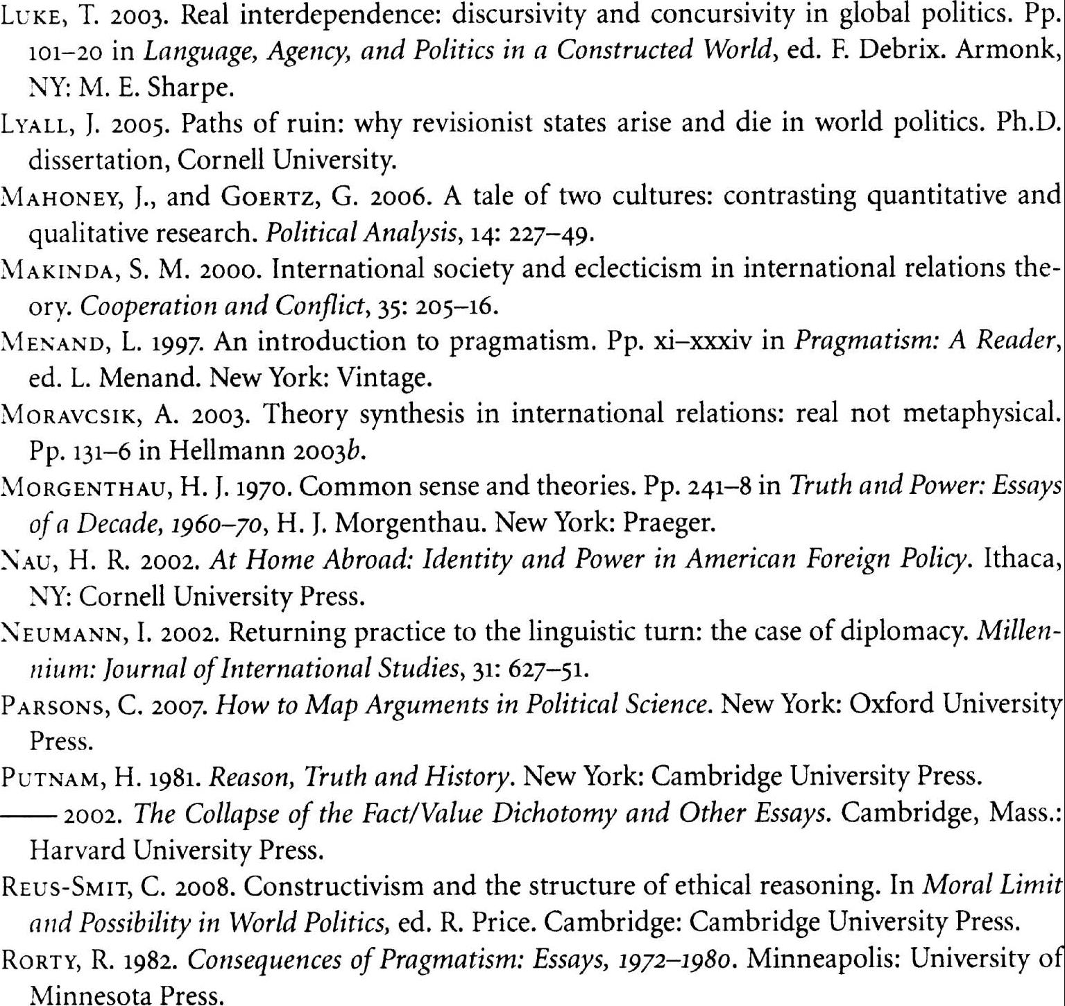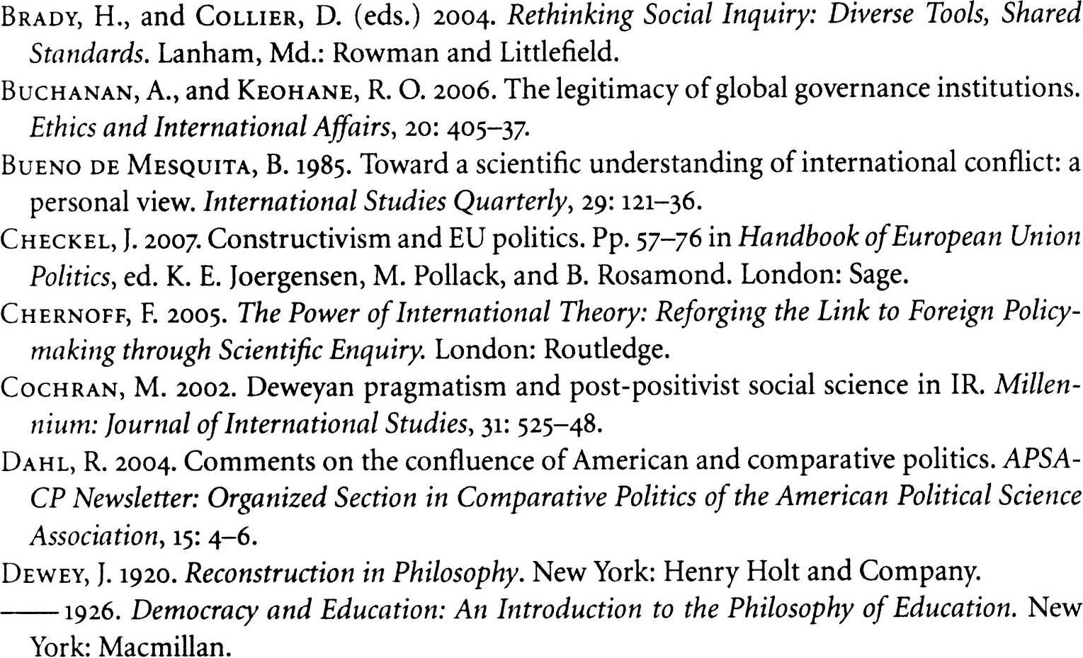 这些原则说明,虽然实用主义者和实证主义者在发现(Chernoff2005)为决策者所用的“真理”上存在广泛的共识,实用主义者拒绝将标准化的方法和技术应用于最终证实或证伪真理假说。因为他们认为,这样的假说都是暂时性的,至多提供“对问题探索的暂时性的栖身之所”(Cochran 2002, 527)。与此相类似,一些理论批评家拒绝接受科学具有结构严谨的、价值中立的制度化知识体系(Bohman 2002; White 2004)。实用主义者和他们原则上都拒绝明晰地区分事实判断和价值判断(Putnam 2002)。但是,批评理论进而得出结论:鉴于其政治影响,学者们应该对所有知识假说持怀疑的态度。相反,实证主义者呼吁不同学者共同体之间应展开对话,逐步减少道德争议及不确定性,为国际关系制定共识性规范和标准,艾伦·布坎南(Allen Buchanan)和罗伯特·基欧汉(Robert Keohane)就曾呼吁(2006)为全球治理机制合法化制定“复杂的标准”。