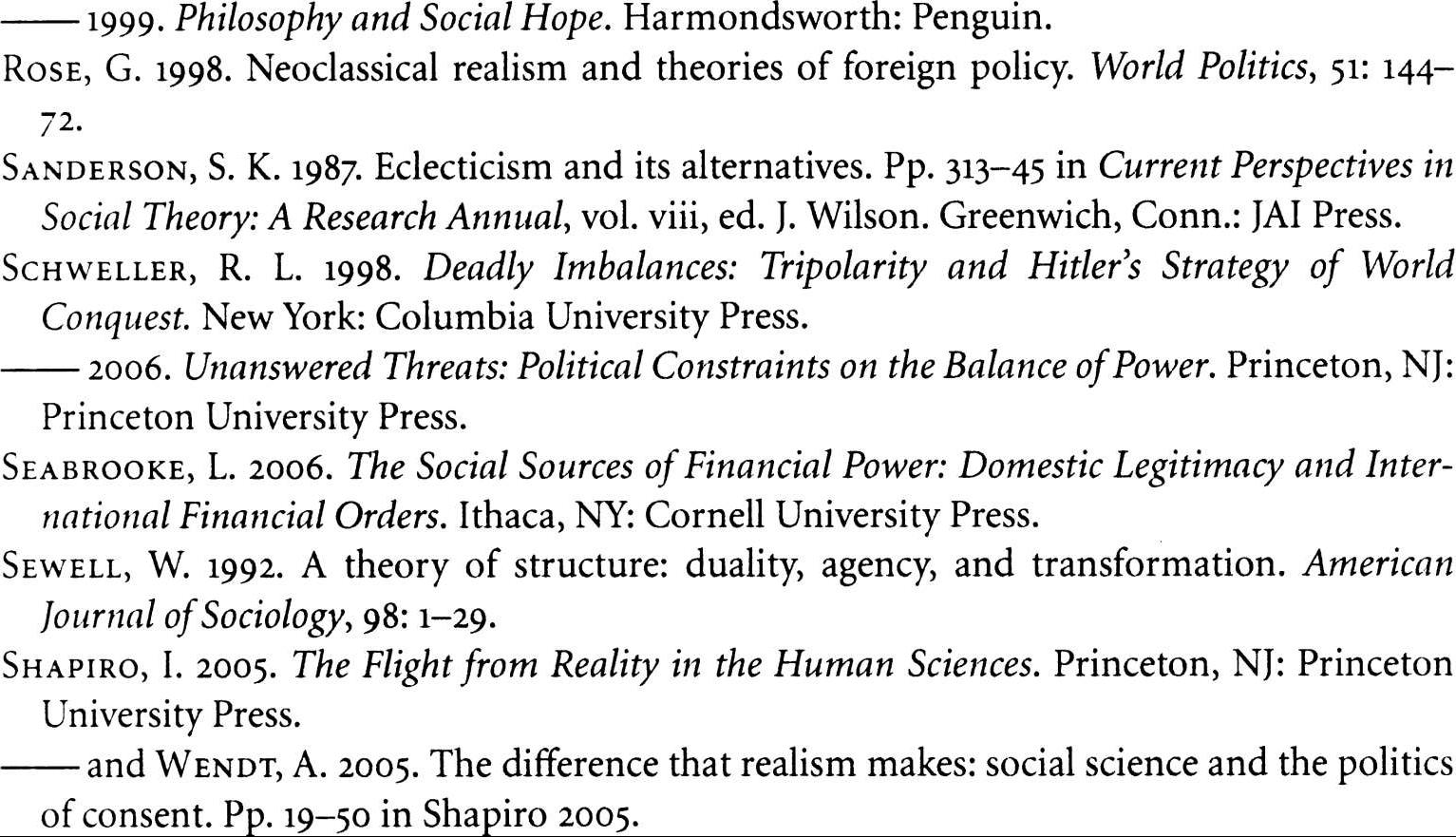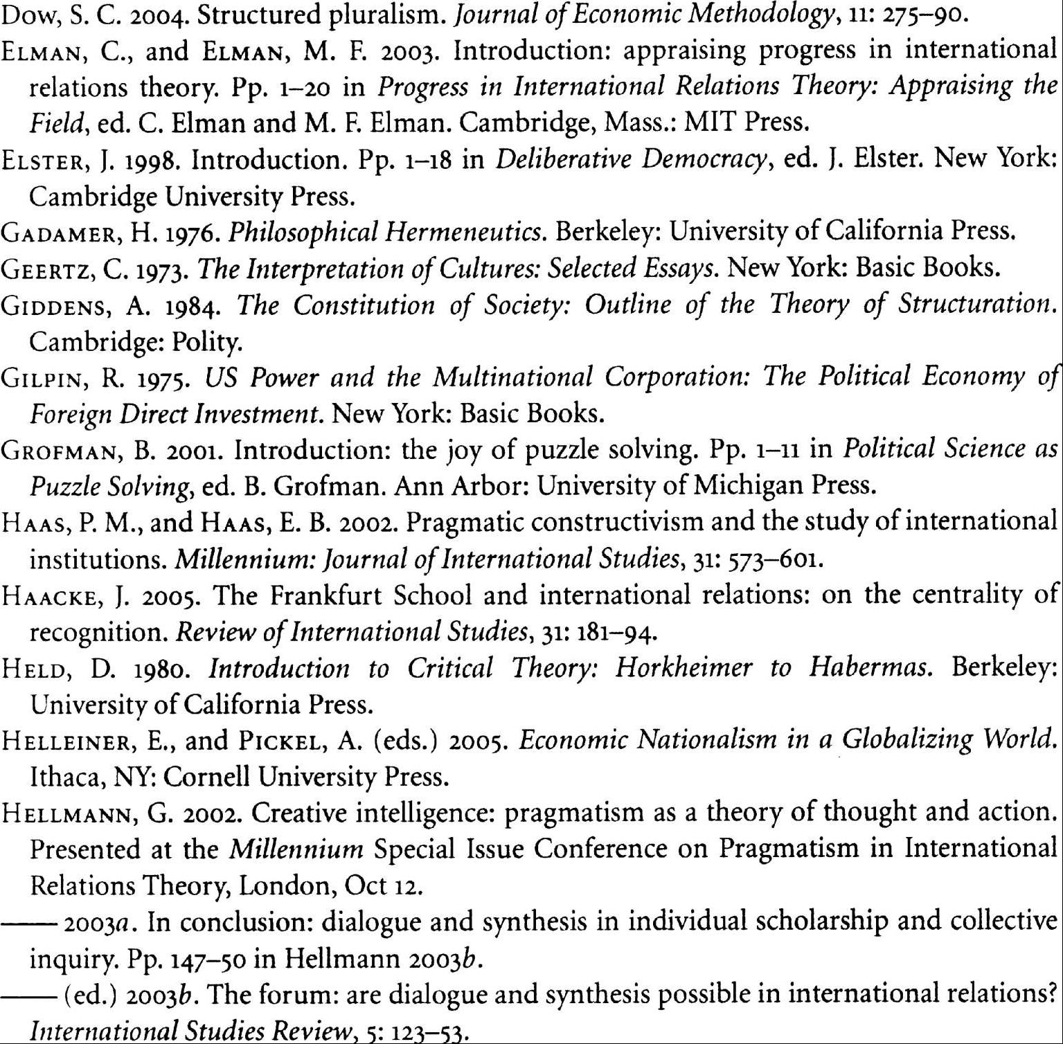 相反,分析折中主义以问题为导向。折中主义承认相互竞争的研究范式会继续存在,并在此基础上进行融汇统合。与此同时,分析折中主义不仅仅是安德鲁·莫拉维斯克(Andrew Moravcsik 2003)所理解的理论合成中的假说叠加版。莫拉维斯克认为,合成理论(contested by Hellmann 2003b)通过严格地使用标准化数据组和可复制的方法可以测试复杂理论的不同组成部分。这种可以分解为各个部分并分别检验的合成理论,并非没有价值。分析折中主义旨在阐明某个具体问题上进程和机制的复杂互动,与合成理论是两回事。折中主义学术的增值并不是忽略目前的研究范式,而是有意让这些研究范式探索并认识到国际关系中复杂的实证和认知联系,这是任何单一的研究范式所无法做到的。实际上,分析折中主义要求对不同研究范式的优点、局限及其之间的互补性均有了解,否则在各个研究共同体内开展更加系统性的工作也无益。与目前的研究范式确实有交互的折中主义有助于产生一大批不同以往的分析和实证要素的组合,这些要素可用于重新定义和解决具有重要实际和规范意义的问题,哪怕这些要素最初是在不同的研究范式中形成的。社会科学若想取得学术进步,开展确定性或概率性分析,与意识到各类可能性同样重要。分析折中主义旨在认识在目前研究范式构筑的理论框架之外的实证和道德可能性;与此同时,继续认可目前的范式并与其交互融合,希望能就国际关系的实际问题扩大对话的范围和质量。