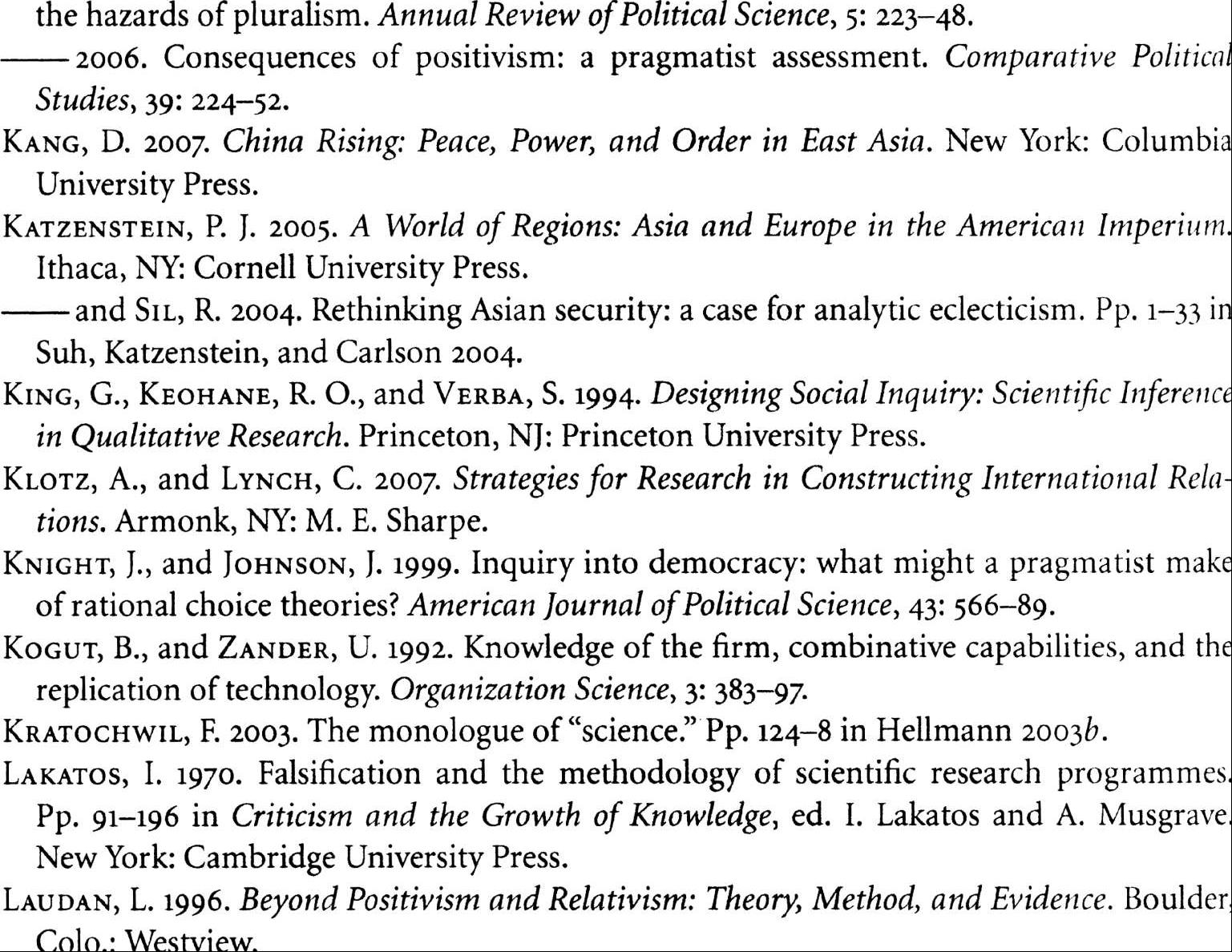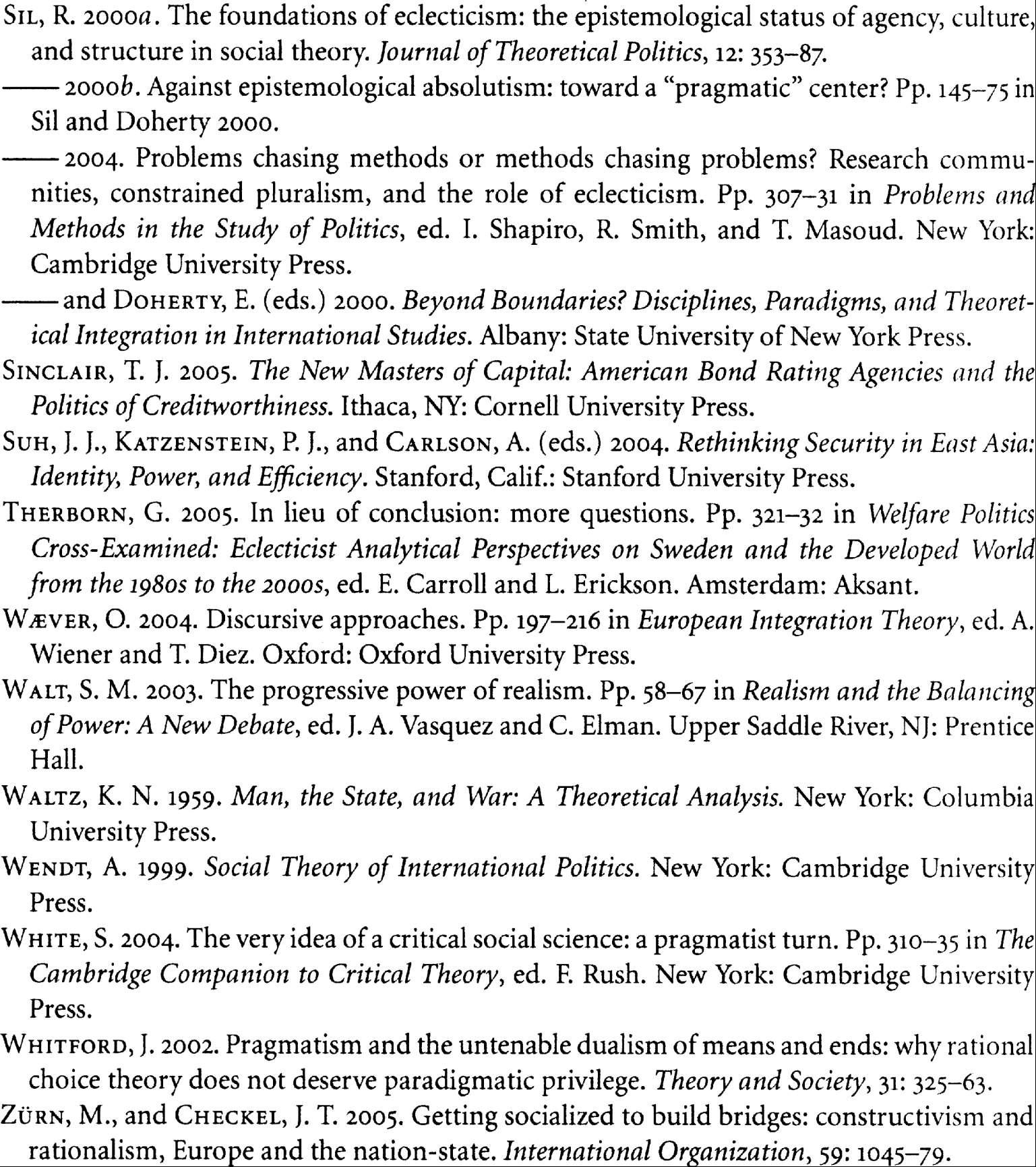 以往,一位好编辑会建议作者抛弃范式,聚焦一个核心问题,就该问题进行充分讨论,也就是说进行问题导向的研究,而不是范式导向的研究。实际上,虽然仍属于少数,但越来越多的学者有意识地超越元理论和方法论方面的争论,他们尝试探索在看似不可通约的研究传统所涵盖的不同现实问题和理论分析之间的关联性(Bernstein et al. 2000; Makinda 2000; Sil and Doherty 2000; Dow 2004; Suh, Katzenstein, and Carlson 2004; Zürn and Checkel 2005)。