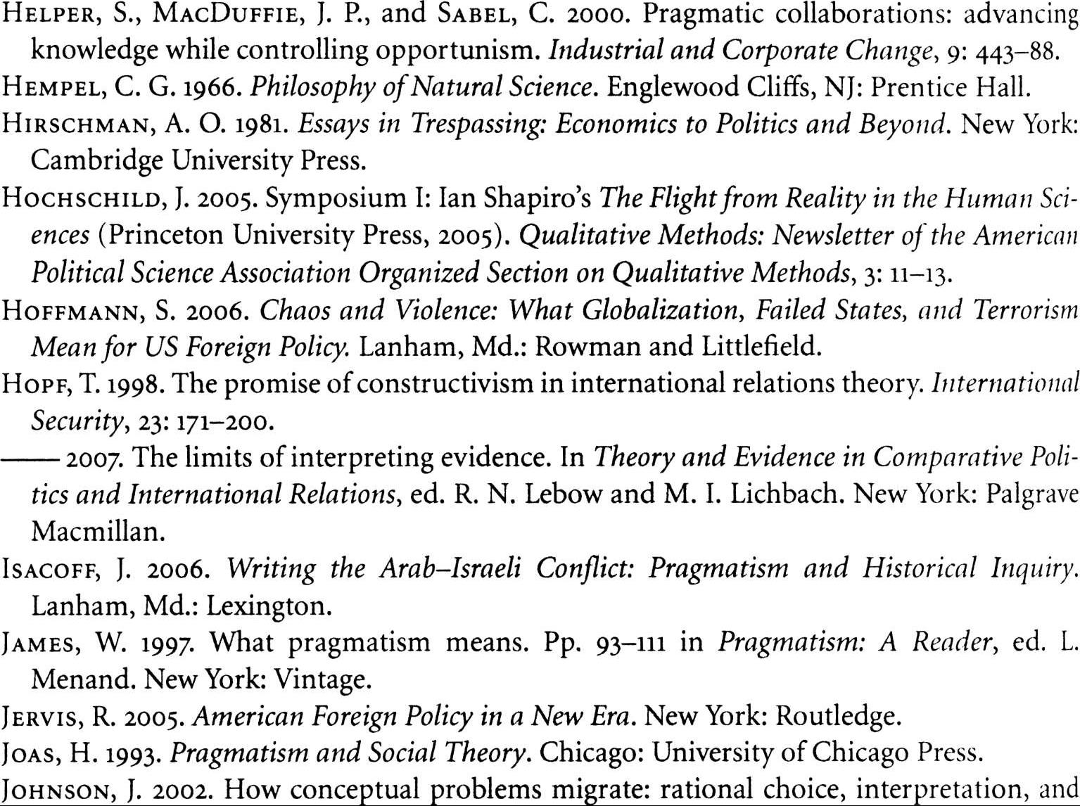 在实证主义和主观主义的各个流派中,实用主义可以视为一个理想型中心(Sil 2000b; 另见Hellmann 2002)。实用主义绝不是某个流派的残留物,其基础是何种知识值得探索,以何种方式、带着何种目的进行探索的、自洽的哲学原则。实用主义可追溯到19世纪晚期和20世纪早期哲学家查尔斯·皮尔斯(Charles Pierce)、威廉·詹姆斯(William James)和约翰·杜威(John Dewey)等学者的著述以及乔治·赫伯特·米德(George Herbert Mead)的社会行为符号互动观点。实用主义在行为革命和对宏大理论的追求的冲击下,曾经一度被边缘化。理查德·罗蒂(Richard Rorty 1982; 1999)和其他同时代的哲学家将实用主义发扬光大,他们对实证主义进行细致批判的同时,也没有沦为相对主义者或主观主义者(例如Bernstein 1983; 1992; Putnam 1981; 2002)。虽然实用主义从不同学术背景和哲学角度(Joas 1993)产生了不同流派,但是它们对社会研究的性质、局限和运用具备一些共识。这些见解体现了一种与实证主义研究传统所假定的进步不同的进步概念,它强调社会科学家之间对话的质量和范围以及这一对话贴近具有重要社会意义的规范行为和政策问题。