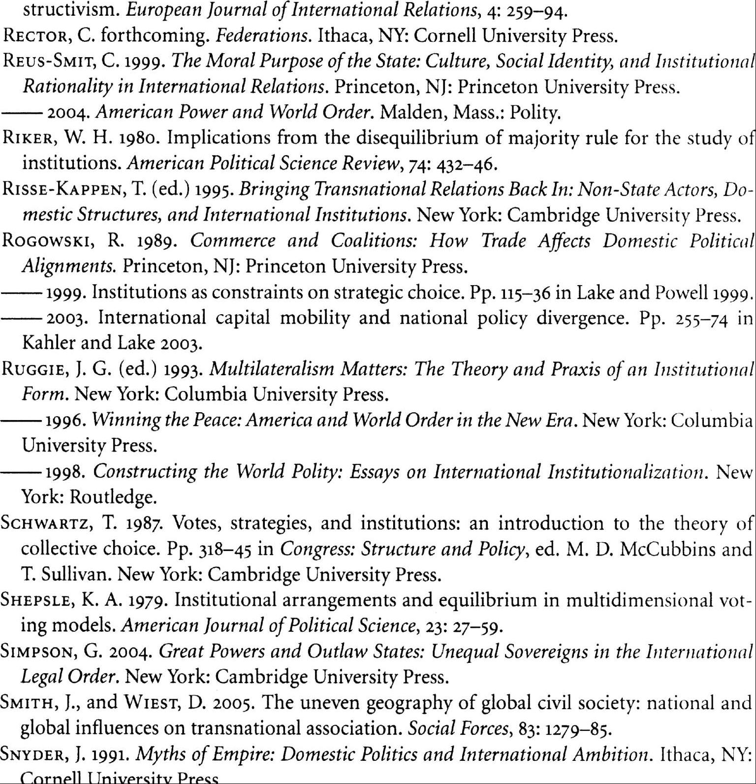 各国因国内分歧在实质和规范方面四分五裂,这一情况在不同背景下对个人的触动也是不同的(Moravcsik 1997)。不同的政治制度在整合不同的国内利益时都带有不同程度的偏见(Rogowski 1999)。这一新研究认为,要了解各国希望获得什么,分析人士必须全力关注那些向来彼此竞争、完全不同的群体是如何被动员加入这一政治进程以及接下来制度如何将利益转变成政策的。